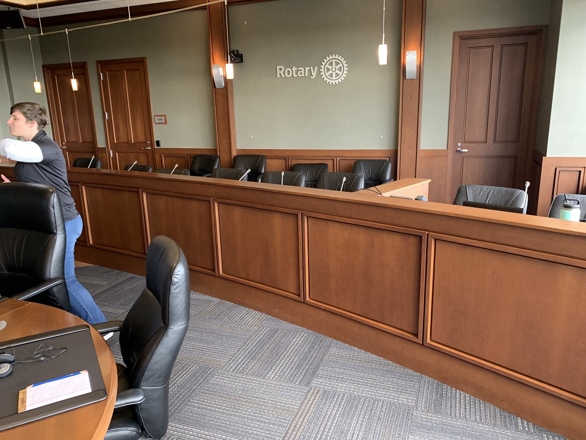 Top meeting room -- head seats to east with wood panel