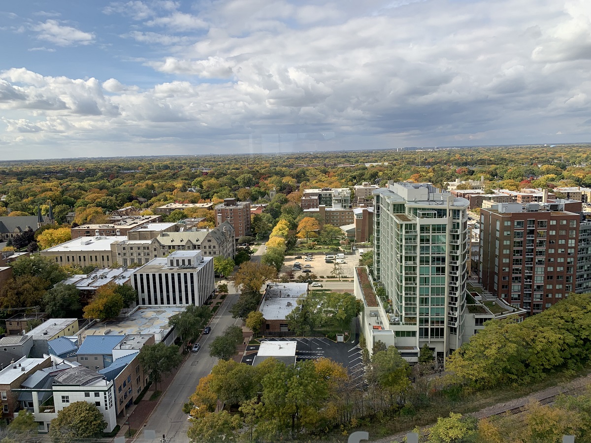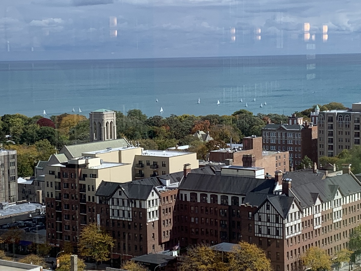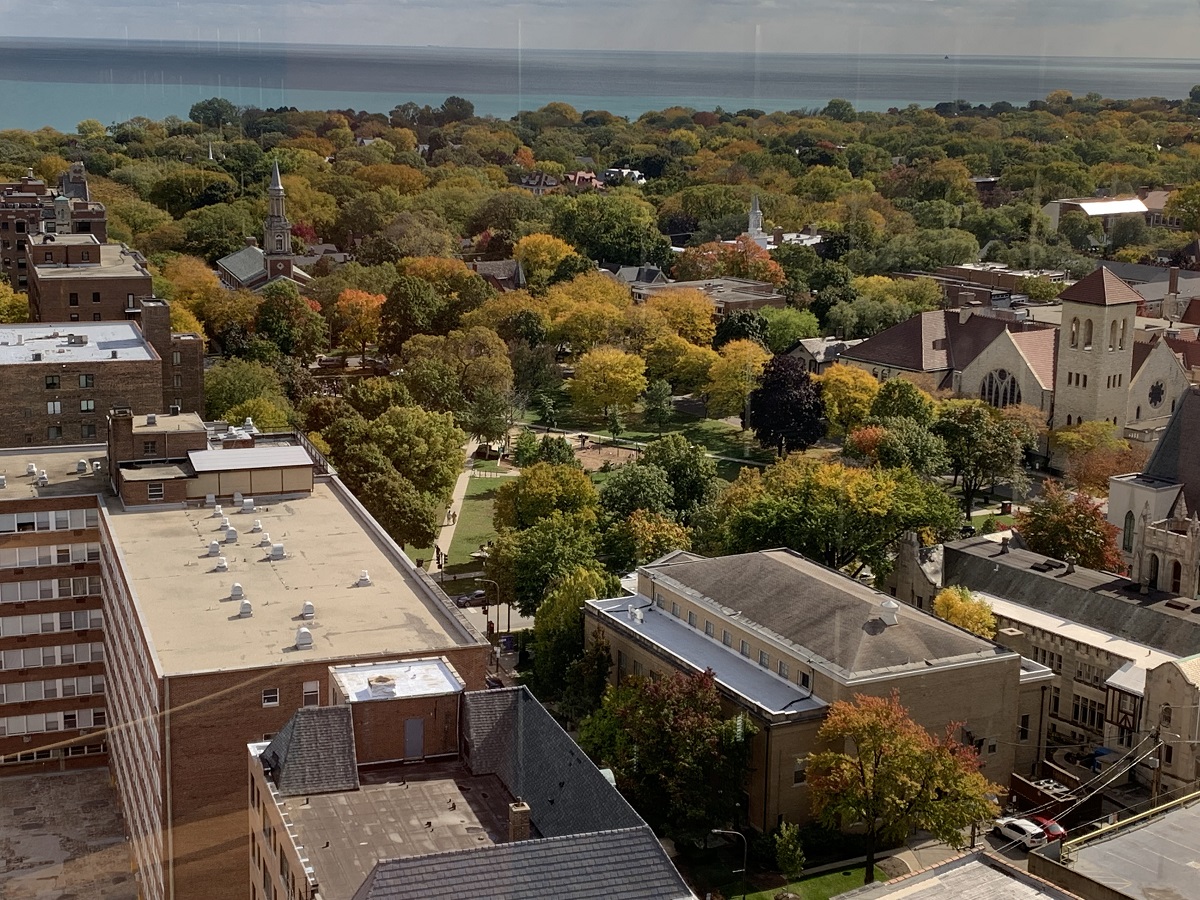 View to southeast showing Raymond Park, colored trees and Lake Michigan