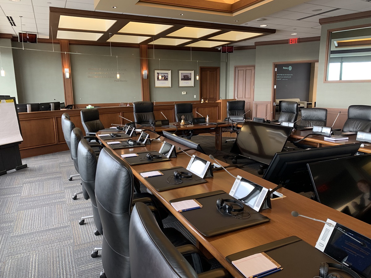 Main meeting table -- each with a monitor and headphones for 8+ languages