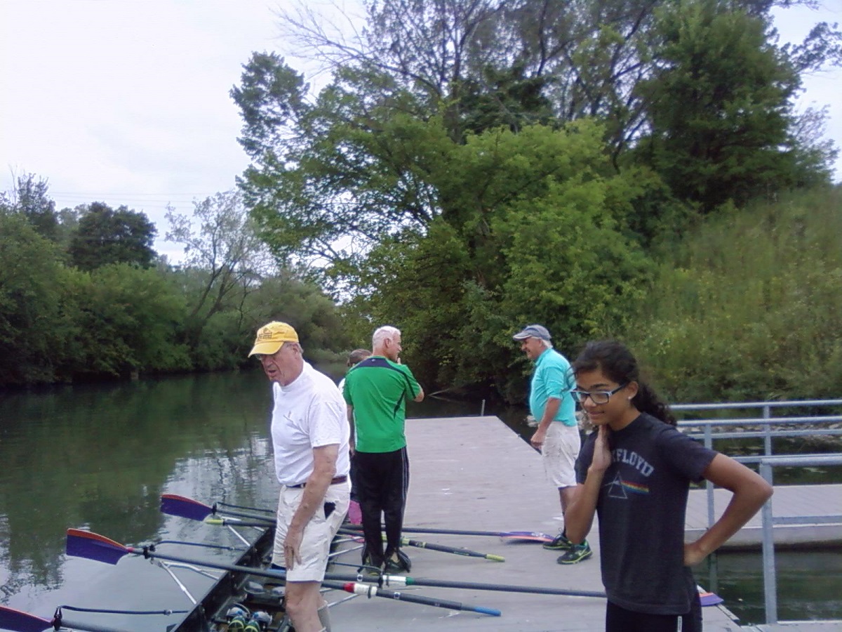 Bill and Warren walking up stairs with oars with Ron down on dock with double