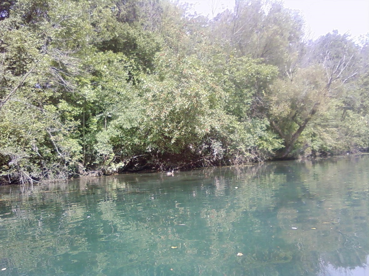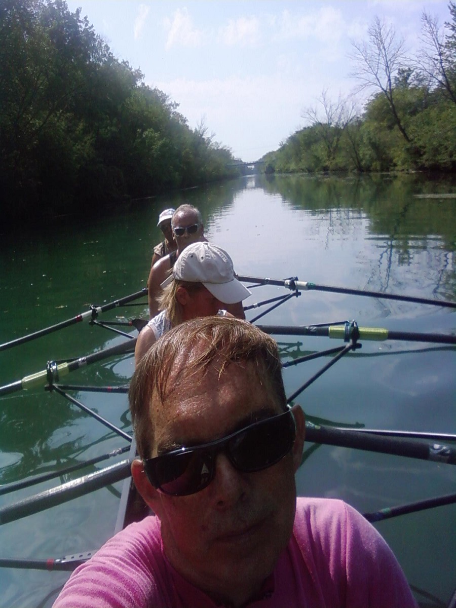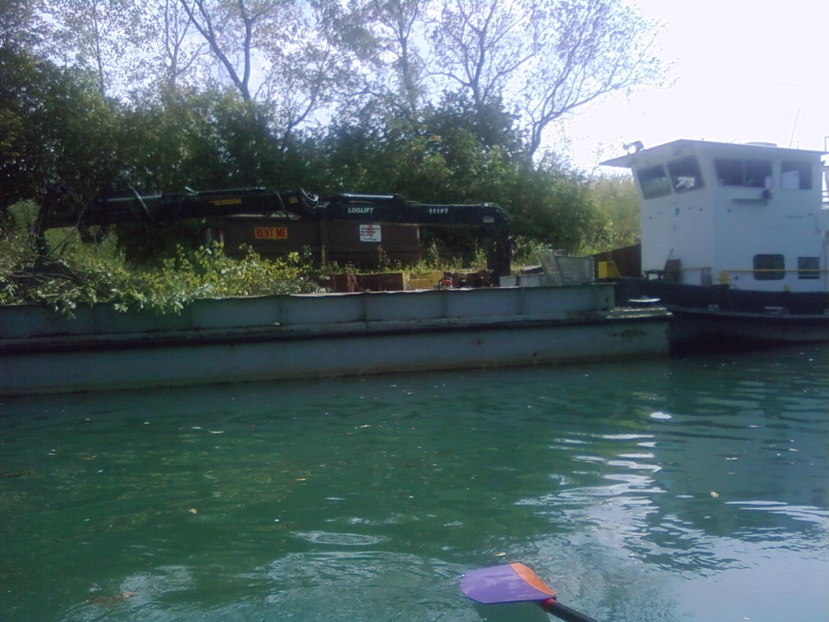 Passing Sanitary District barge for collecting fallen trees and algee from canal