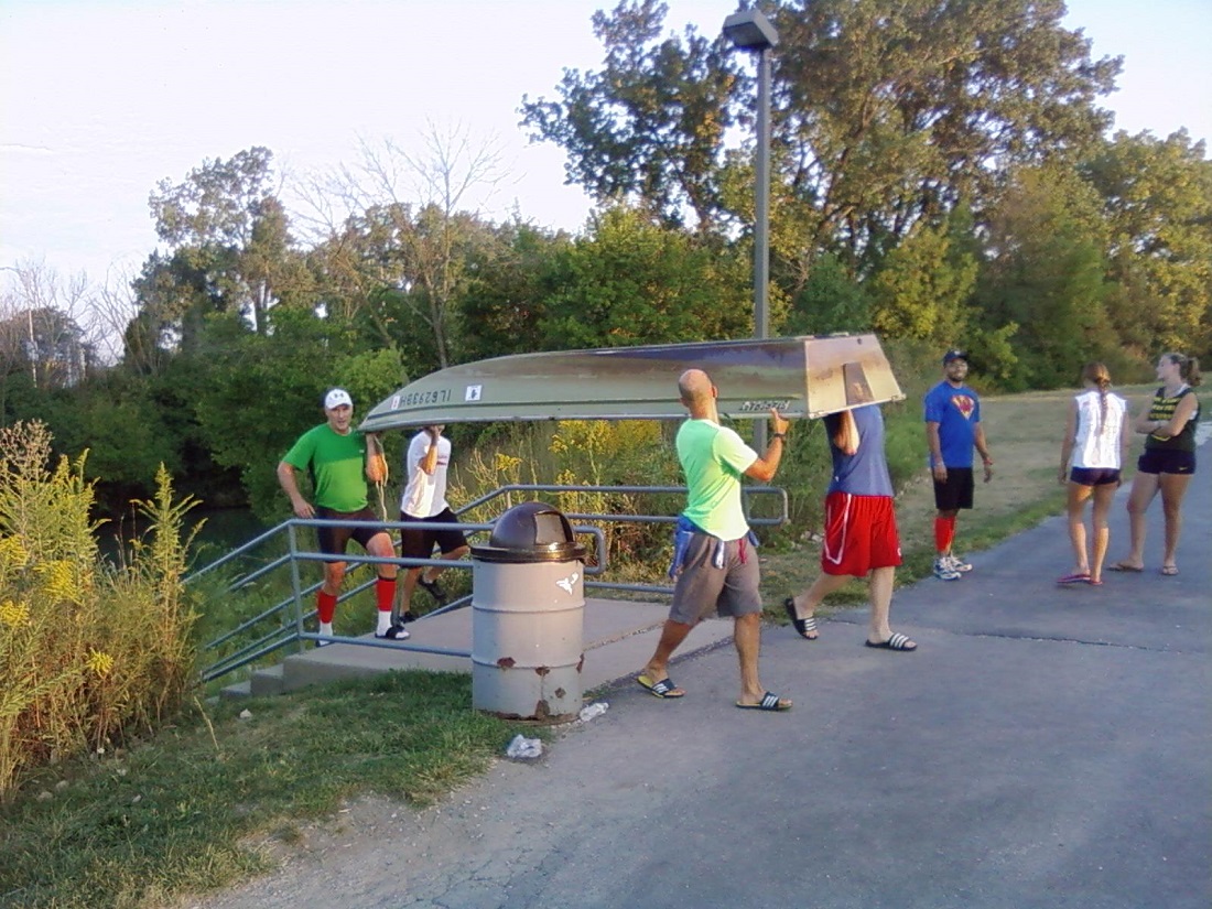 Students bringing power boat up stairs