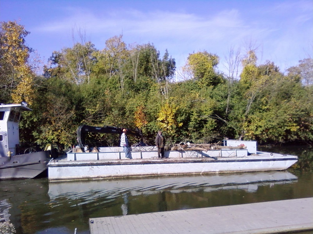 Large barge scooping trees out of canal passing dock at Oakton