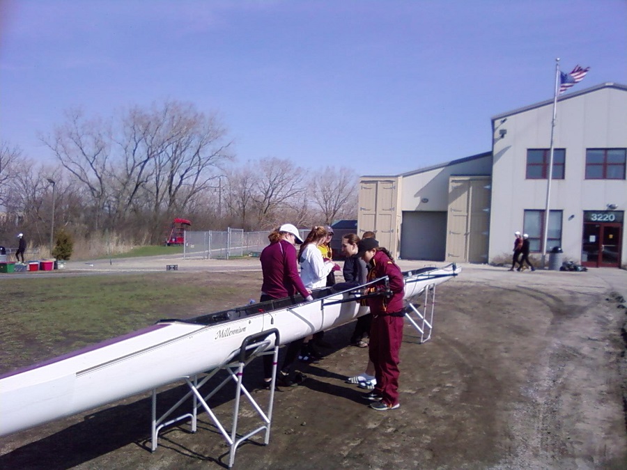 Students removing riggers at Oakton Rowing Center -- the flag shows the strong southwest wind