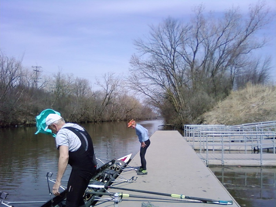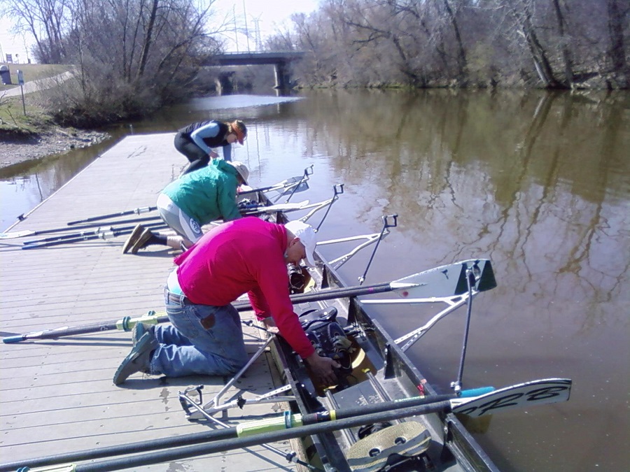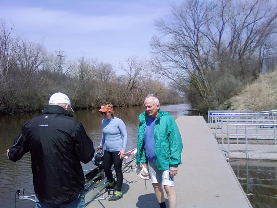 Donna, Warren, and Ron preparing our quad sculling shell at the Oakton dock