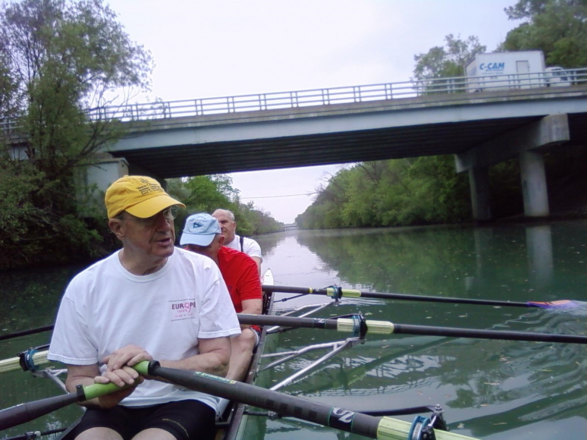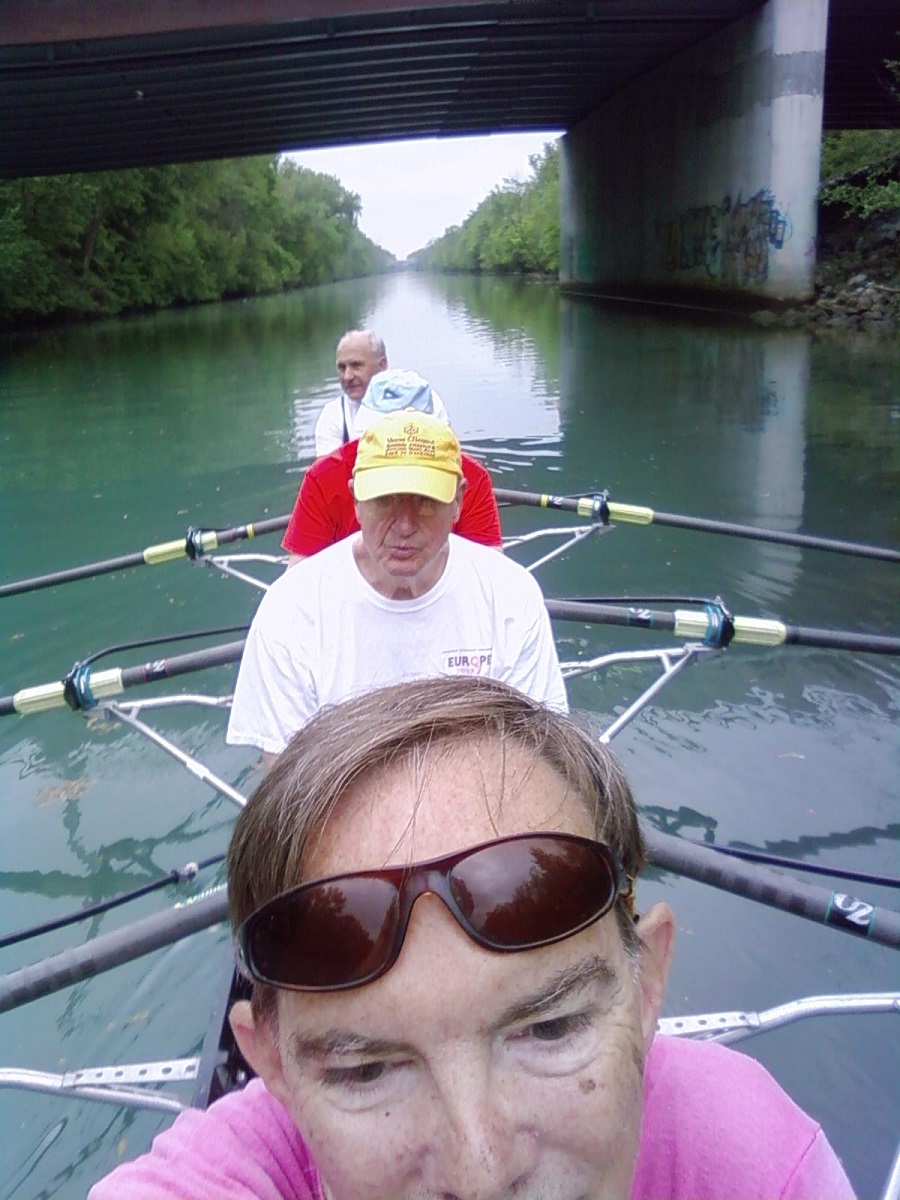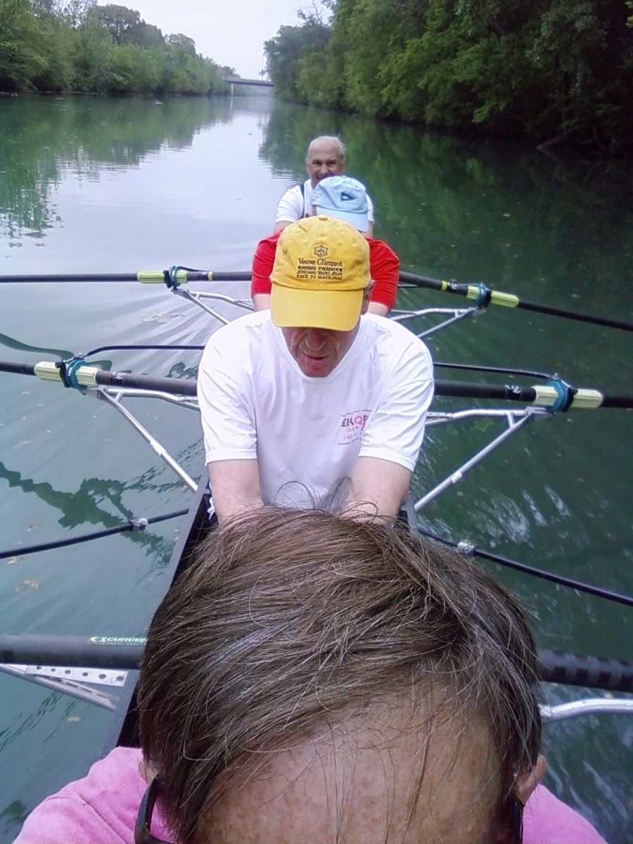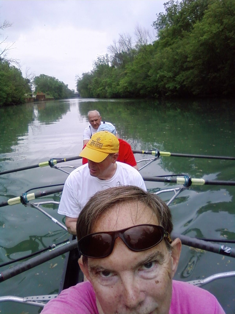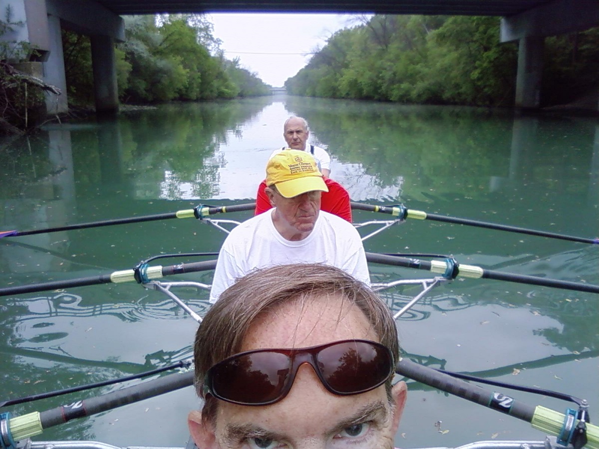 Bill, Warren and Ron in quad slowly heading north from dock with Bill learning to scull for first time