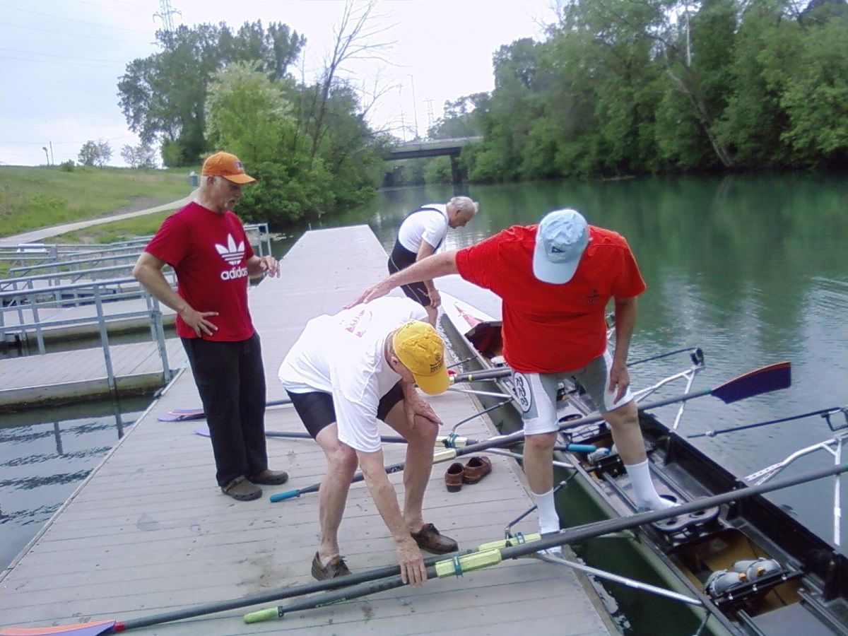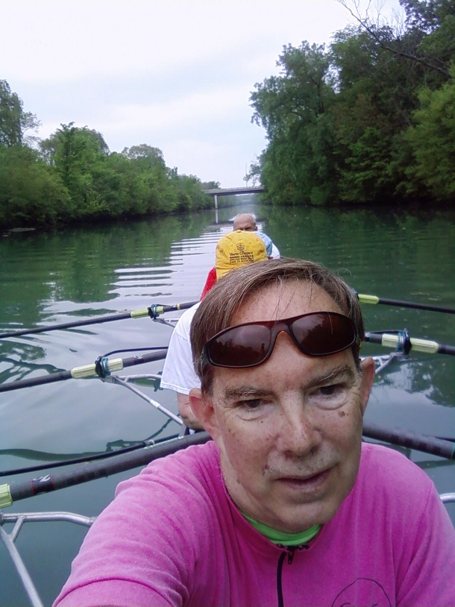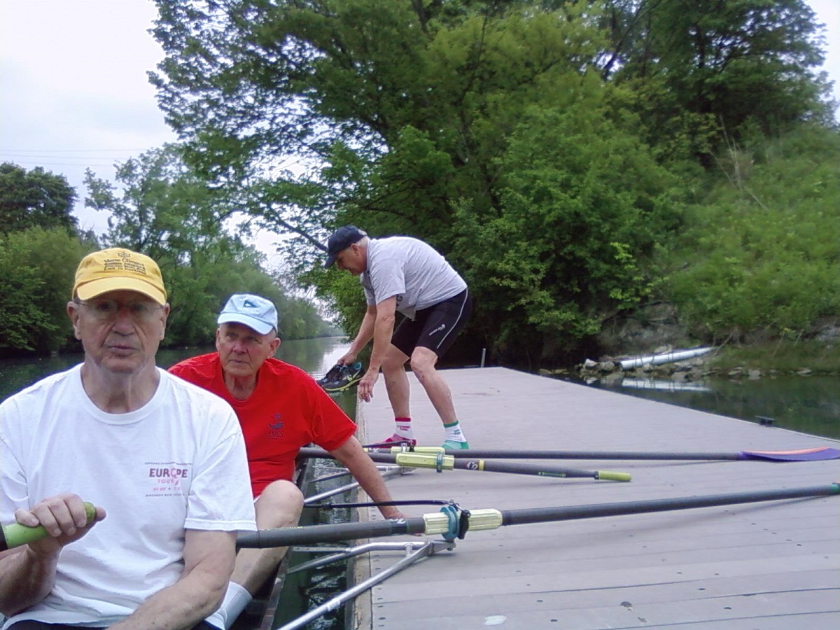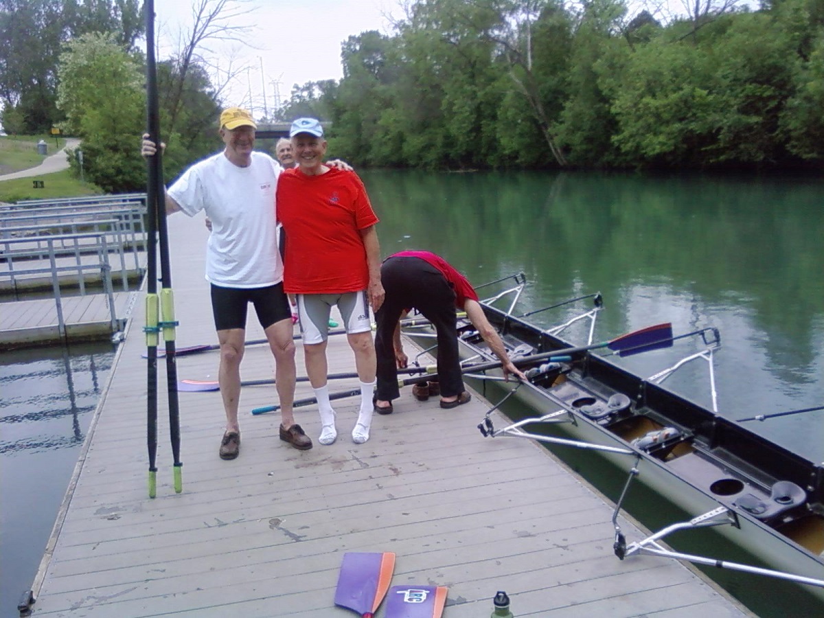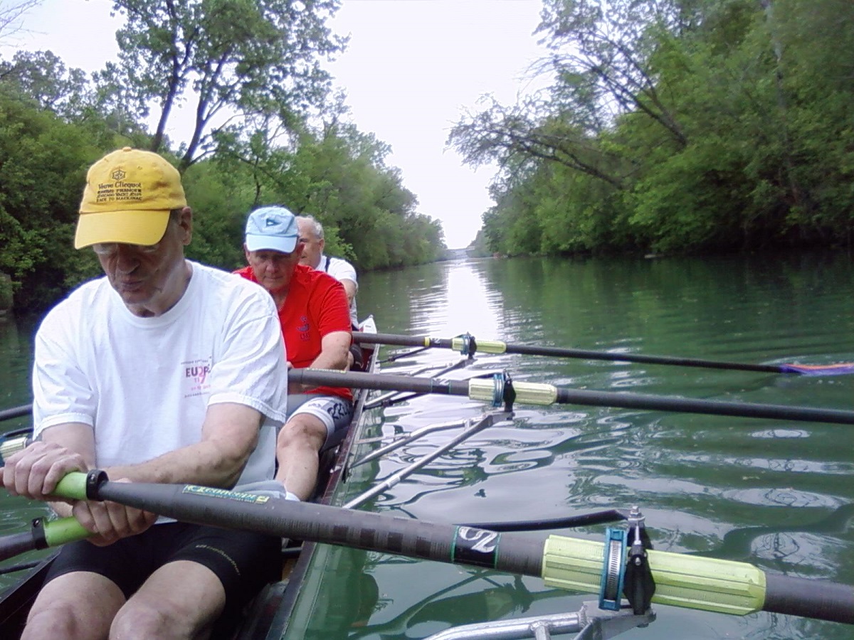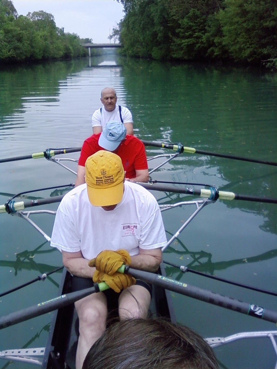 Bill, Warren and Ron in quad slowly heading north from dock with Bill learning to scull for first time
