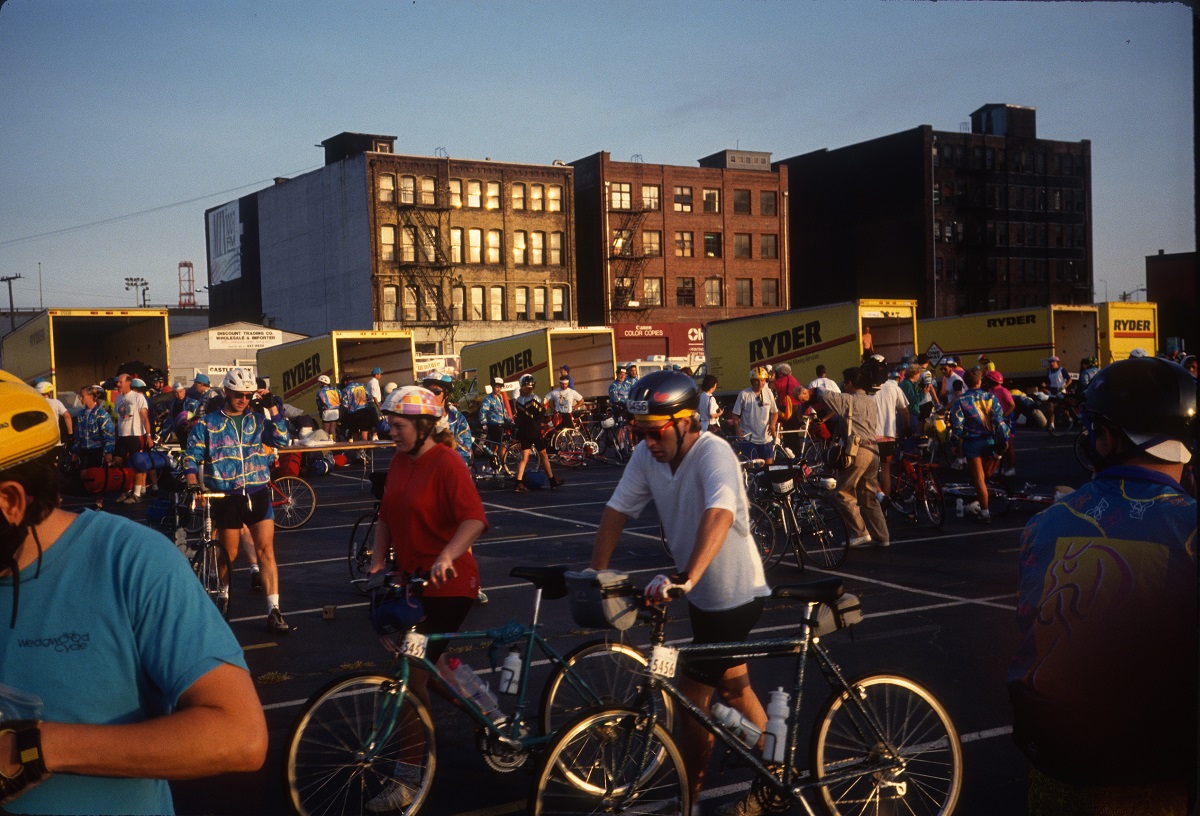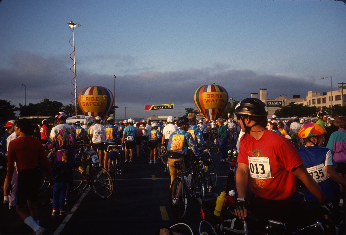 Start line with "Ride Safely" and "Drink Water" baloons. and Tom (with lucky bib number)