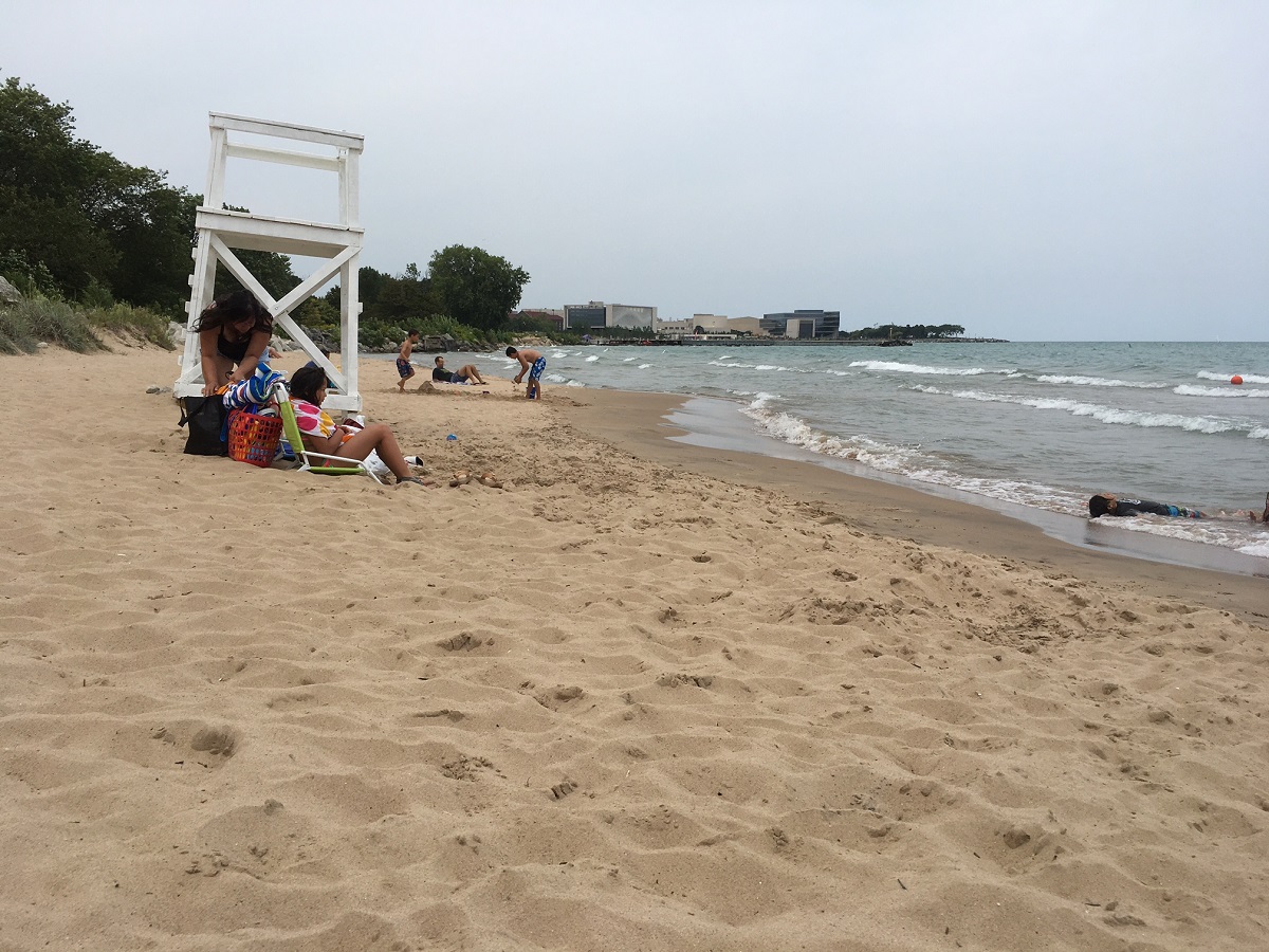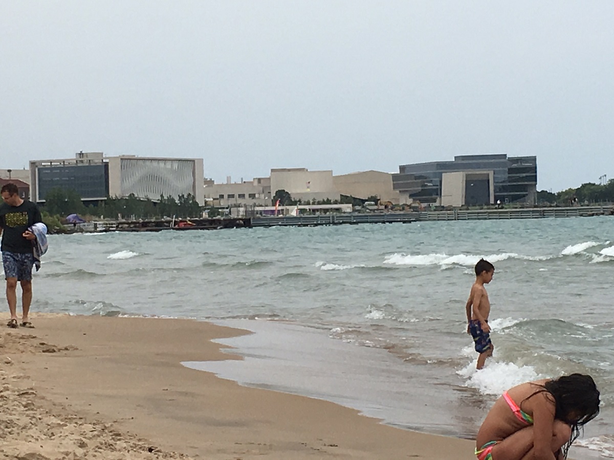 A telephoto shot of the new Northwestern music buildings and kids swimming