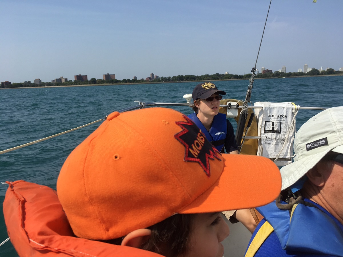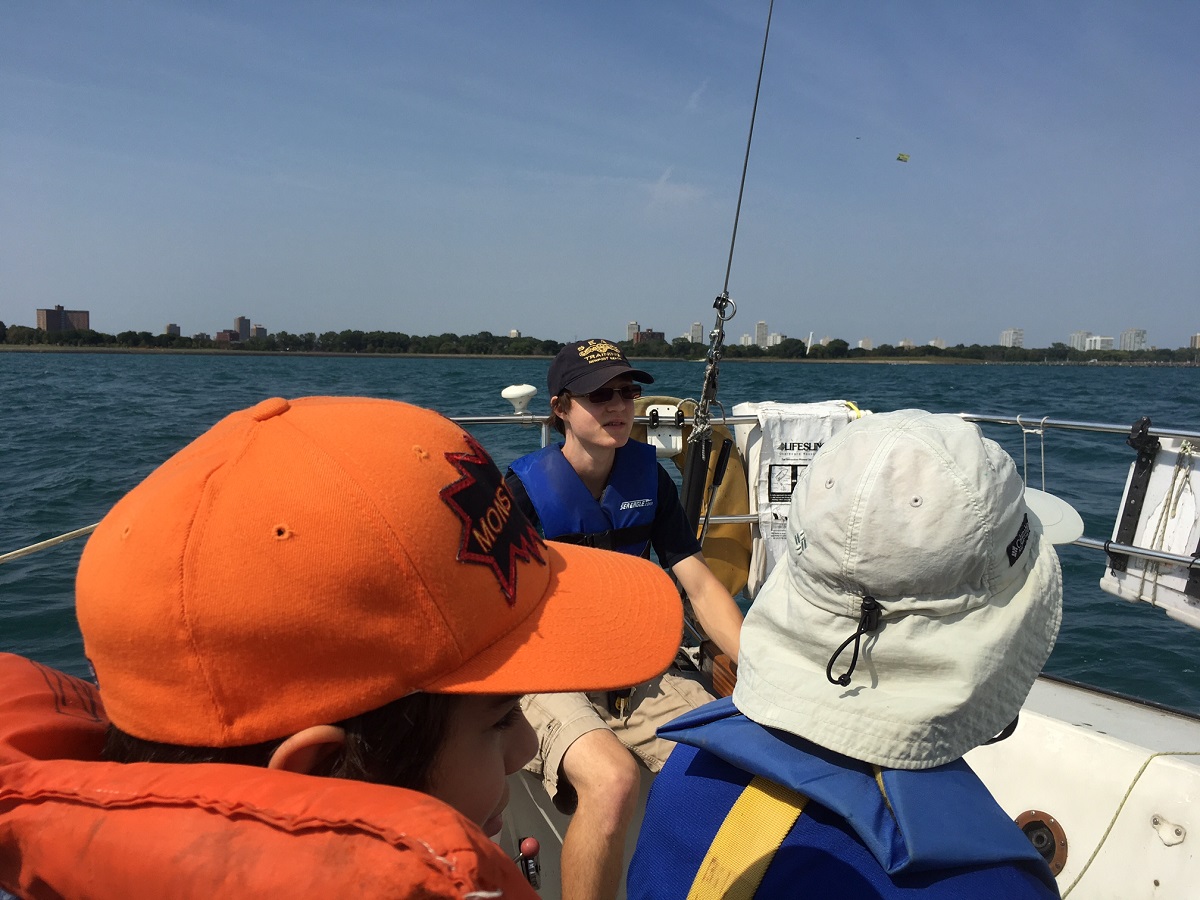 Captain Bill with downtown Chicago, Navy Pier, and just a few of the many sailboats out that day
