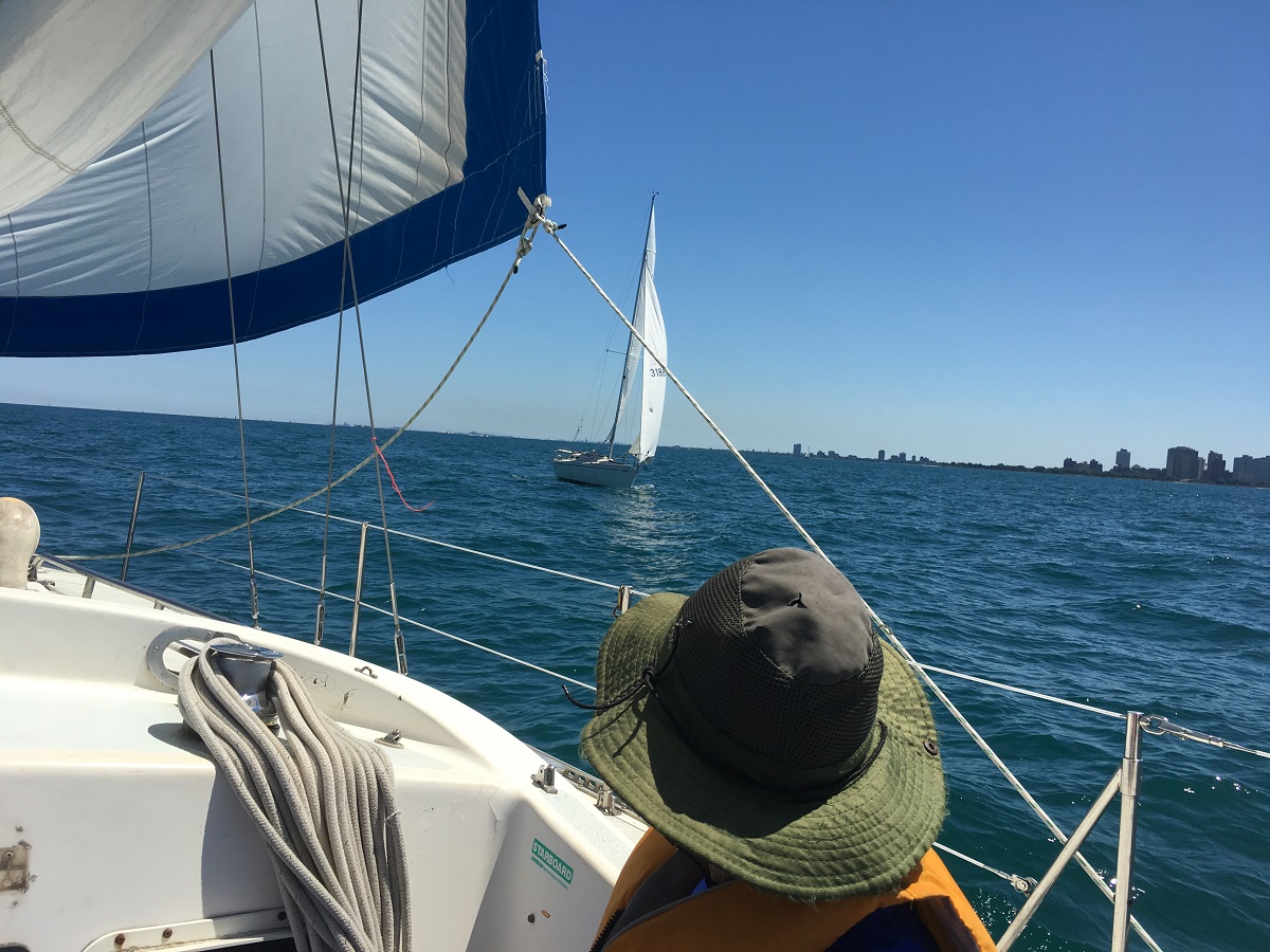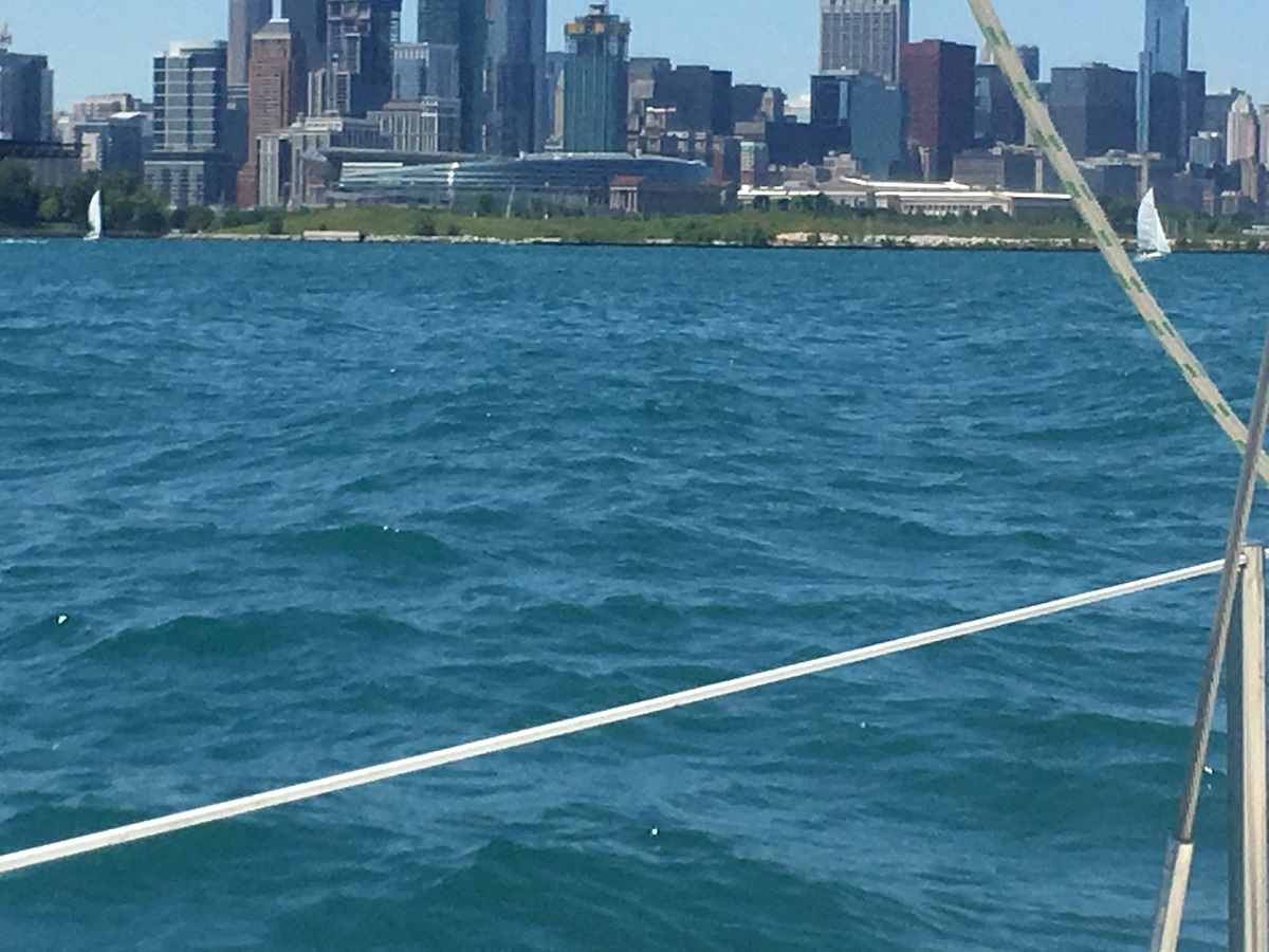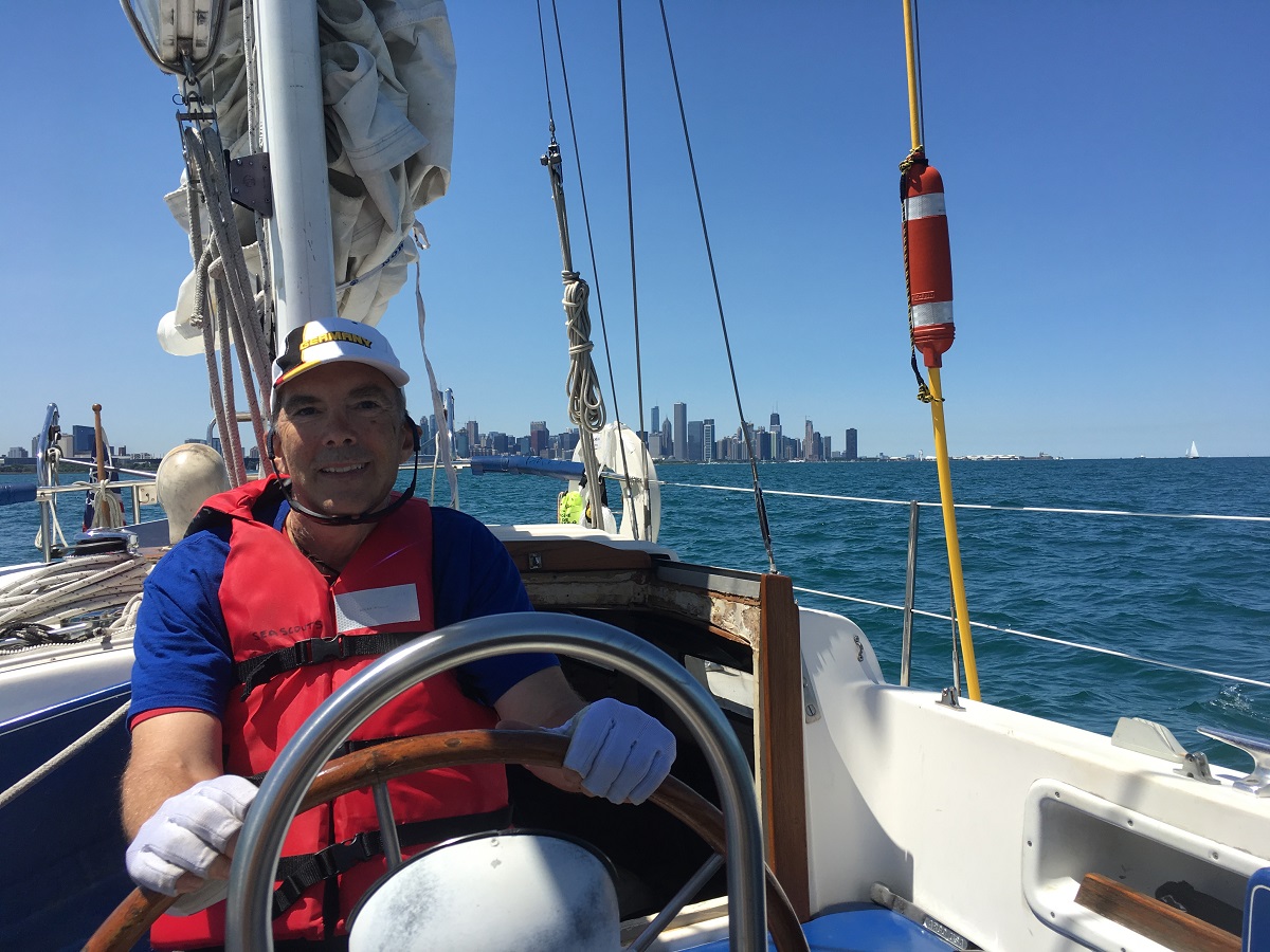Andy steering south with Chicago skyline