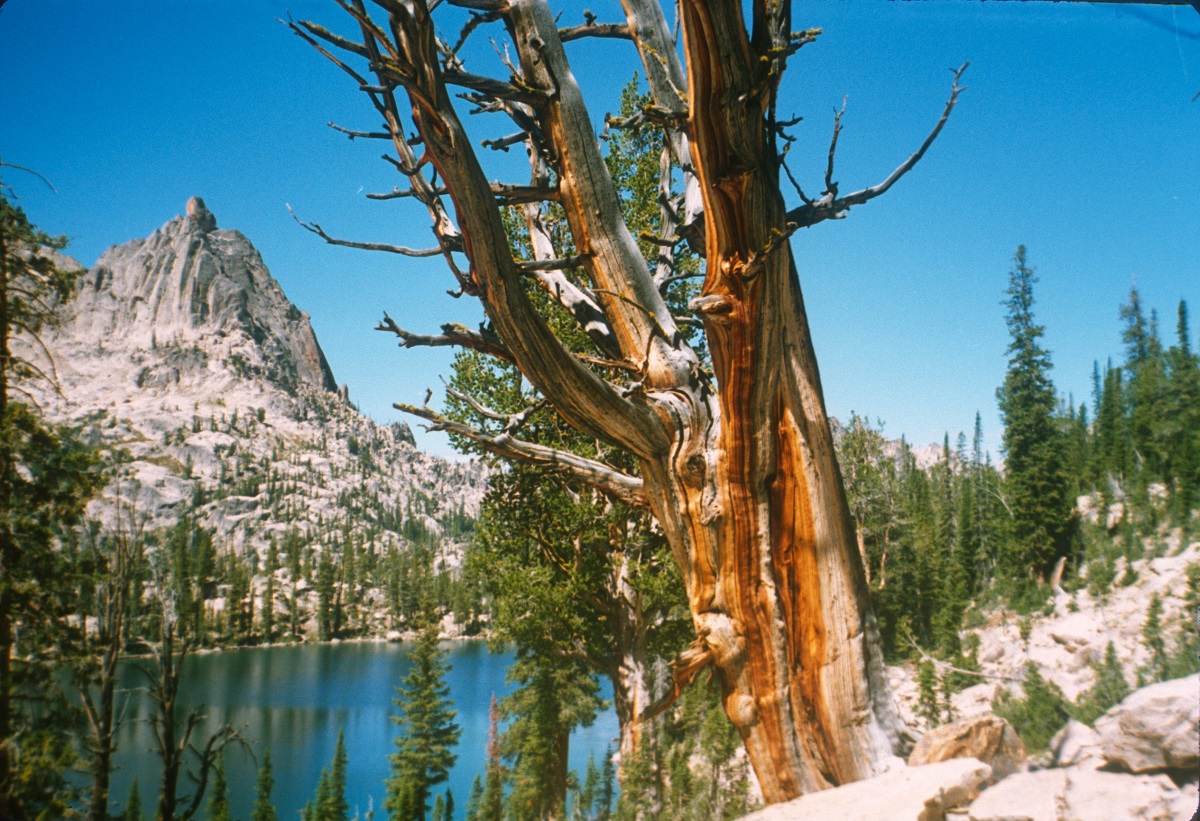 Beautiful colored dead tree with peak and Lower Baron Lake
