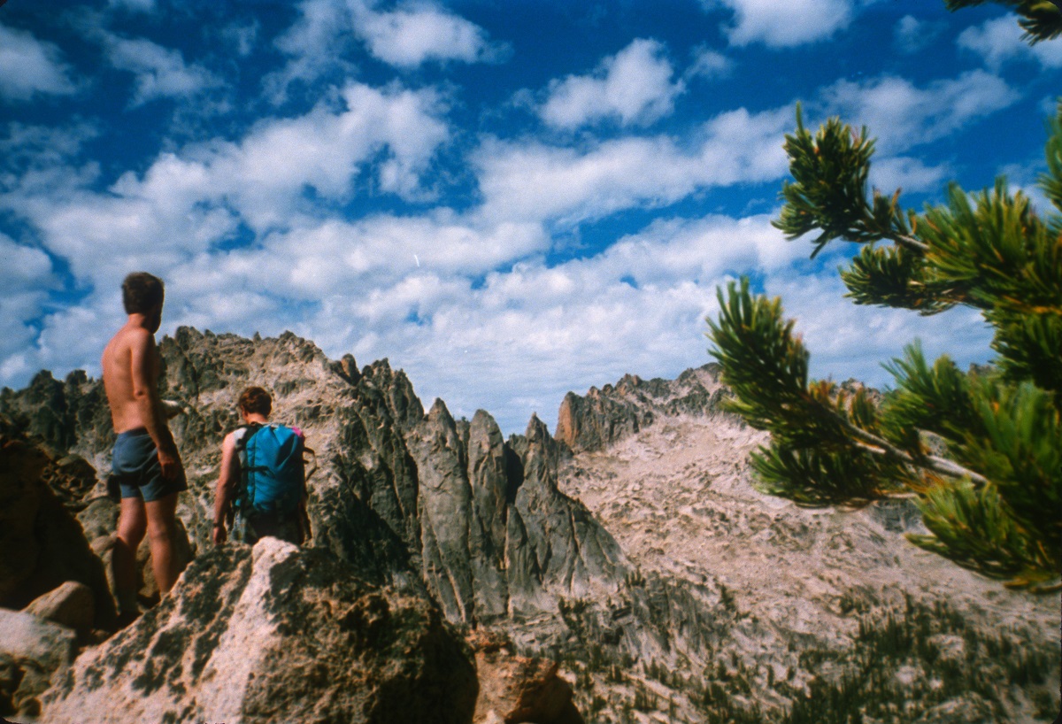 Charlie and Kalus with jagged Sawtooth Mountains.