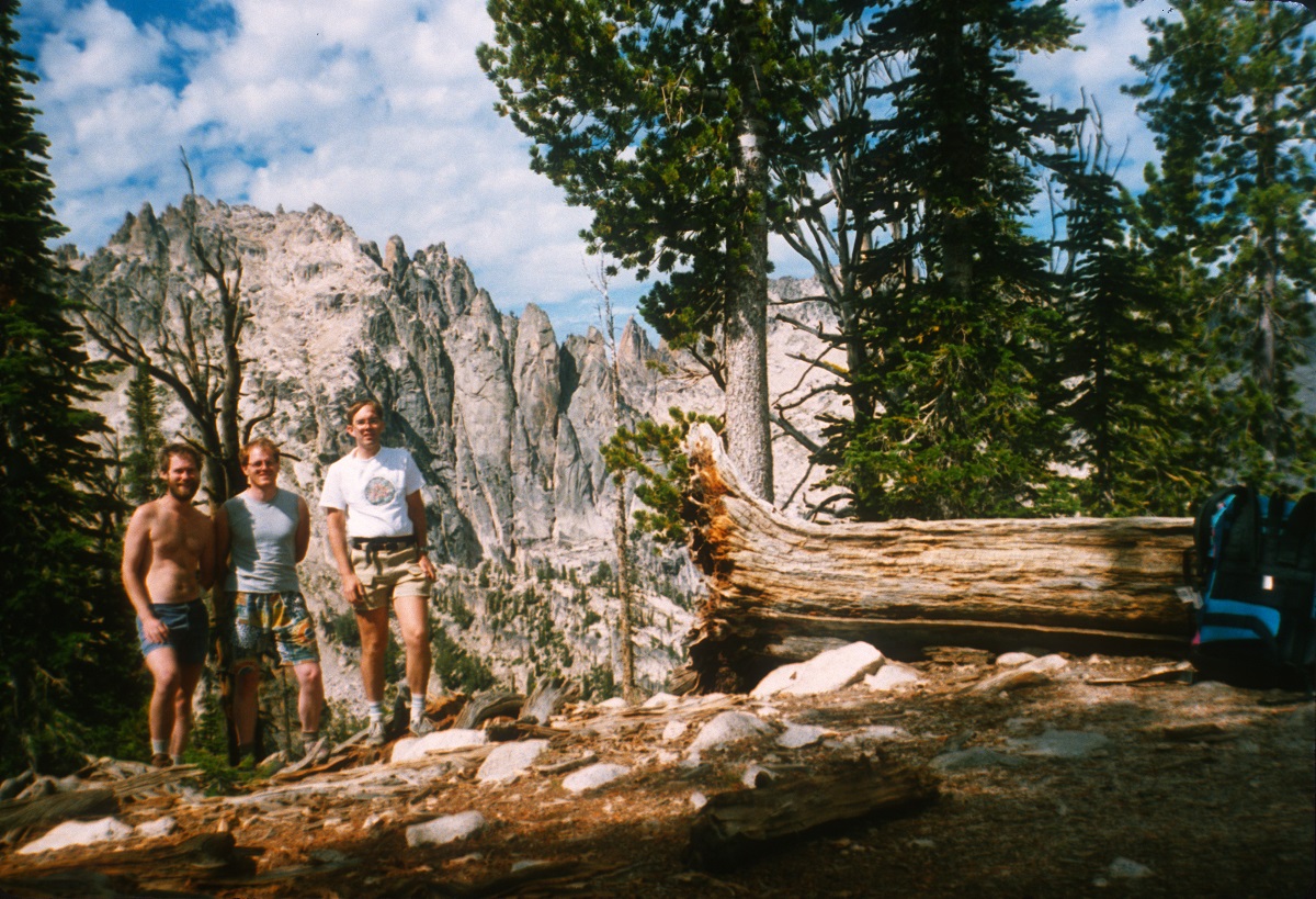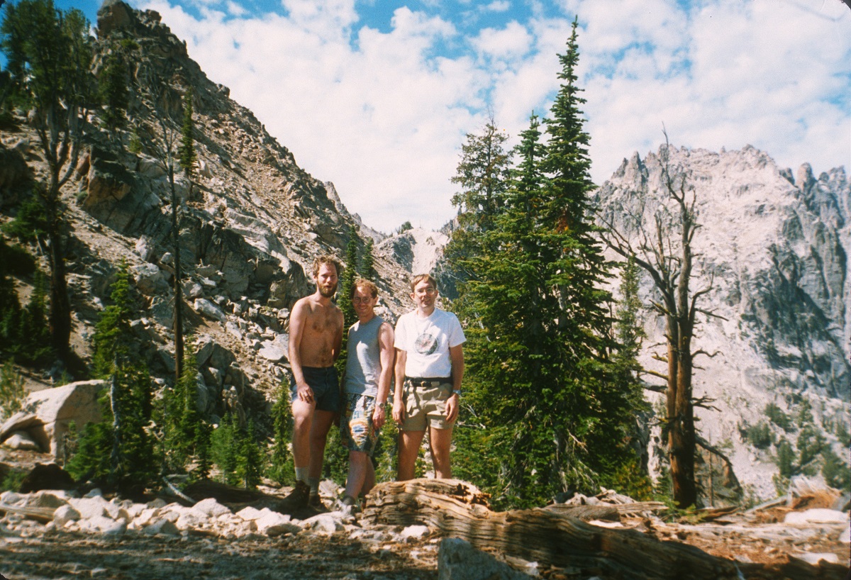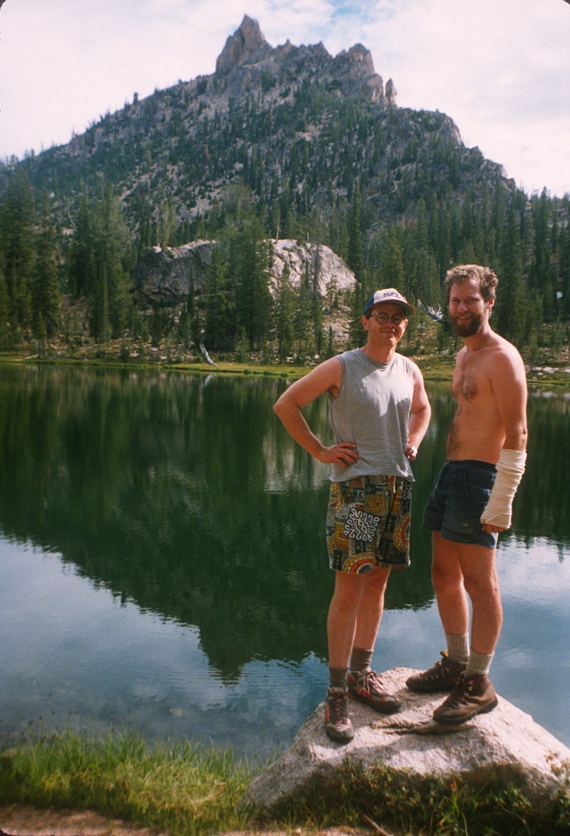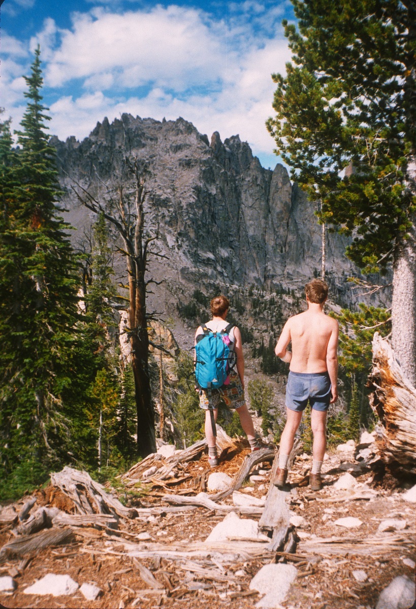 Kalus and Charlie below Jagged Sawtooth Mountains and Upper Baron Lake