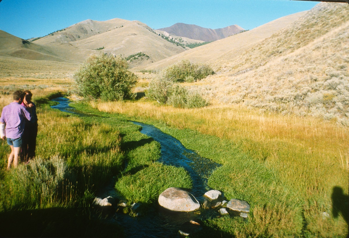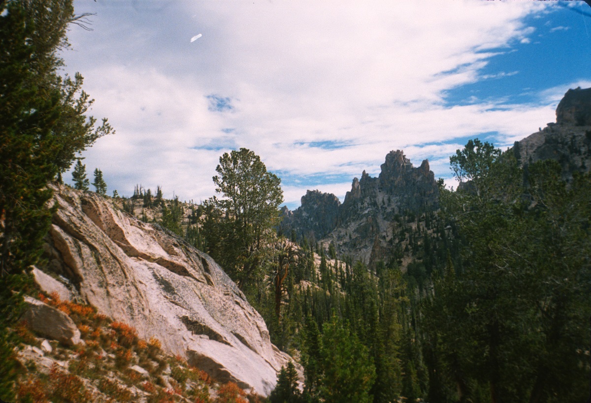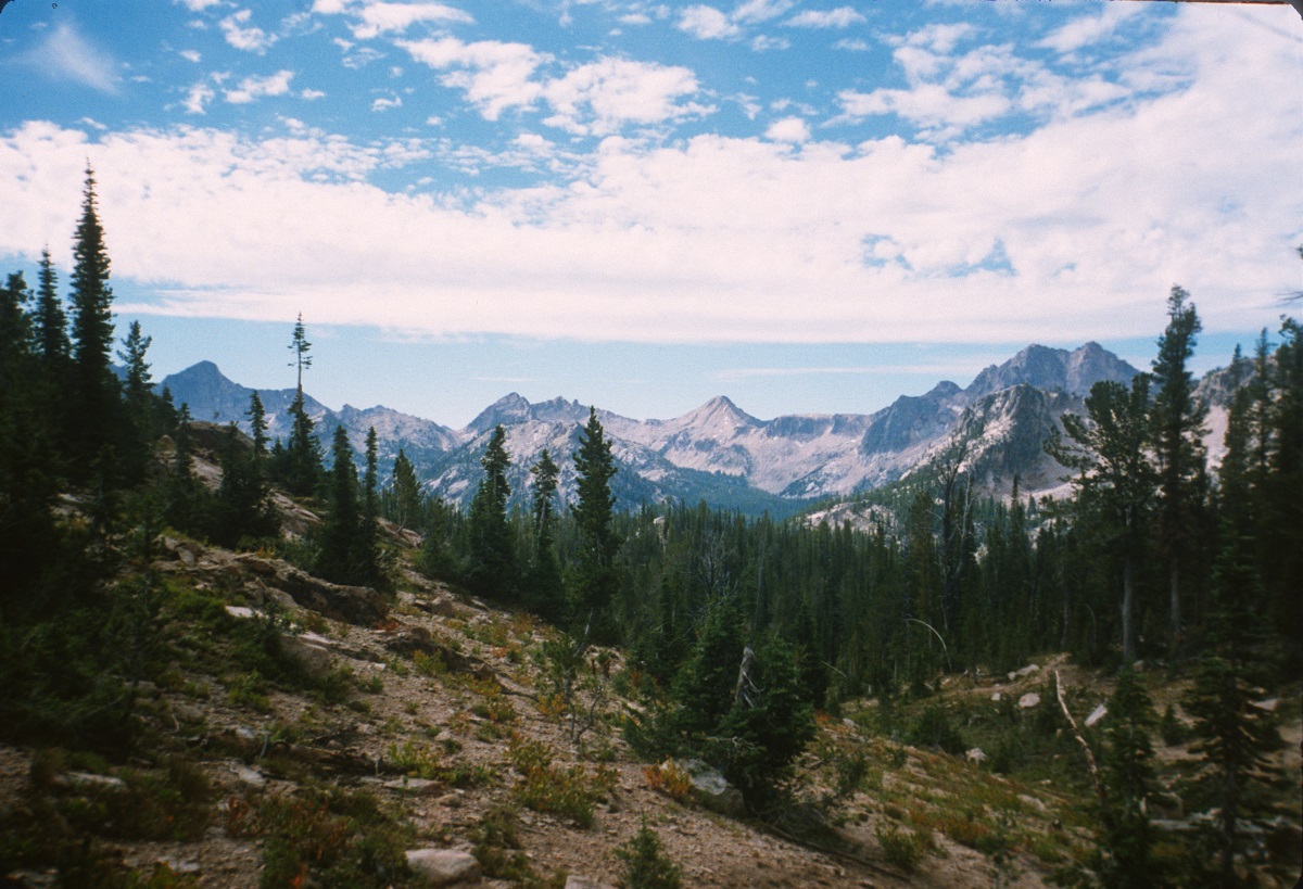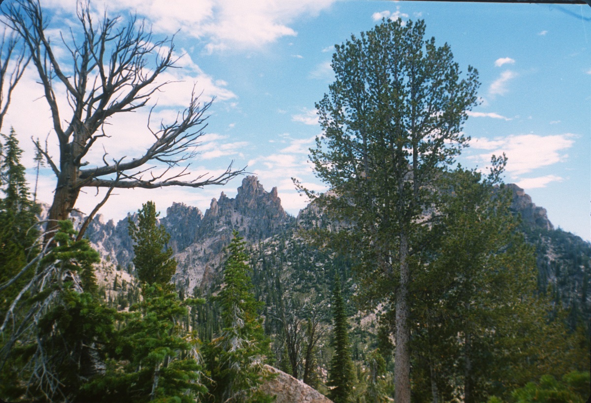 Kalus and Charlie below Jagged Sawtooth Mountains and Upper Baron Lake