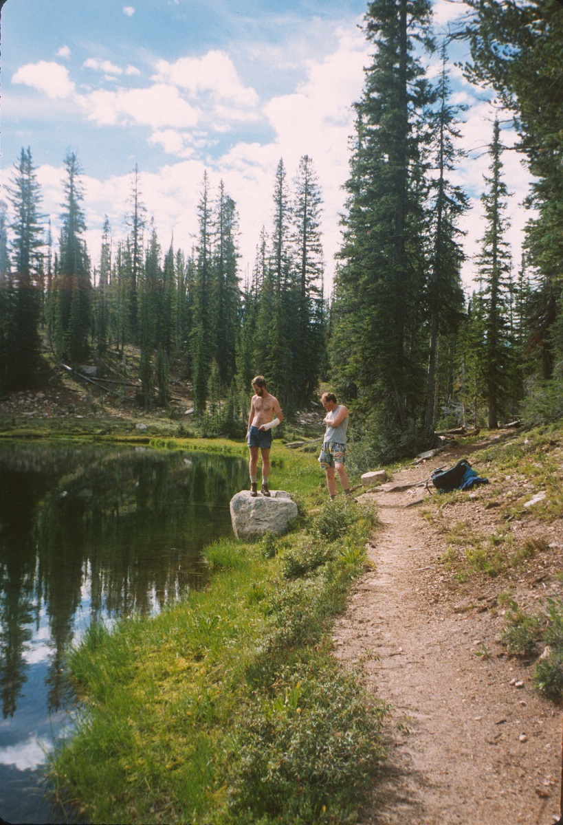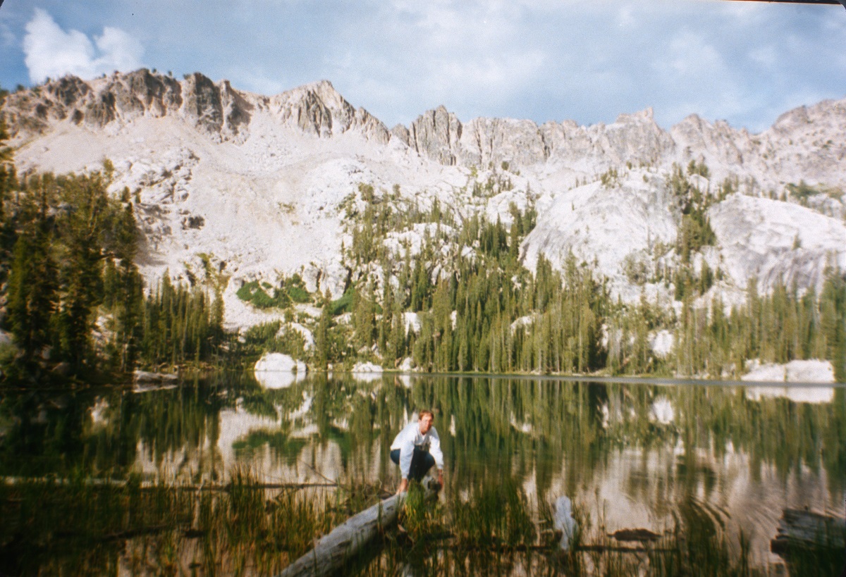 Andy getting water in Upper Baron Lake on beautiful calm day with perfect reflection