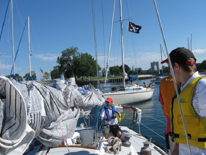 "Pirate" boat with dog passing in Montrose Harbor, Bill, downtown & Sea Scout