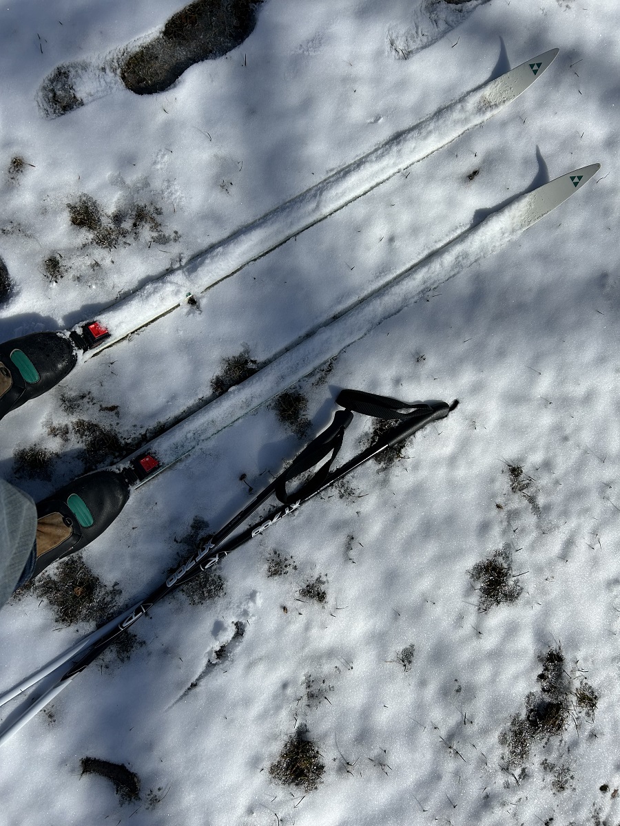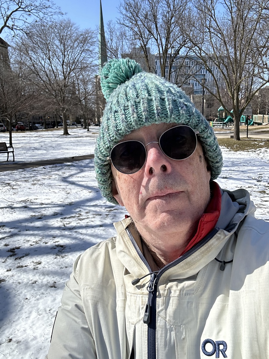 Andy on limited snow in Raymond Park, Evanston with Lake St. Church steeple