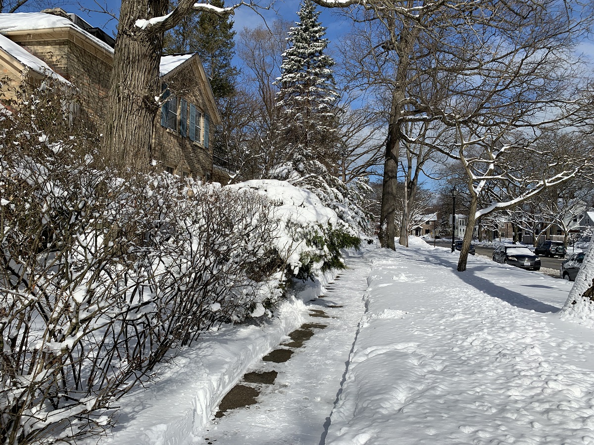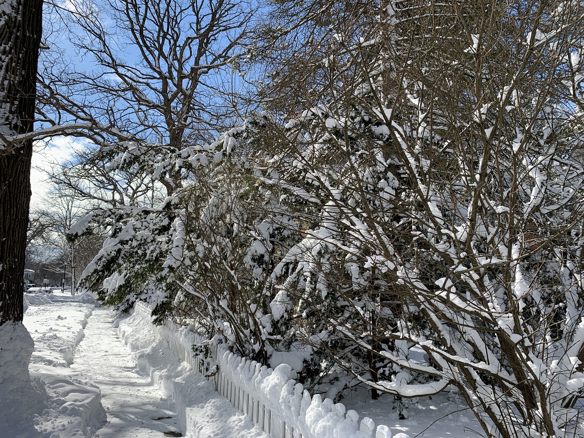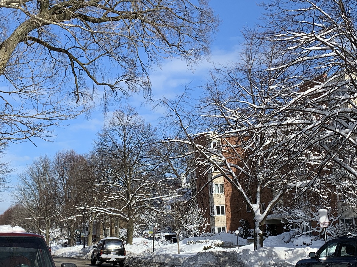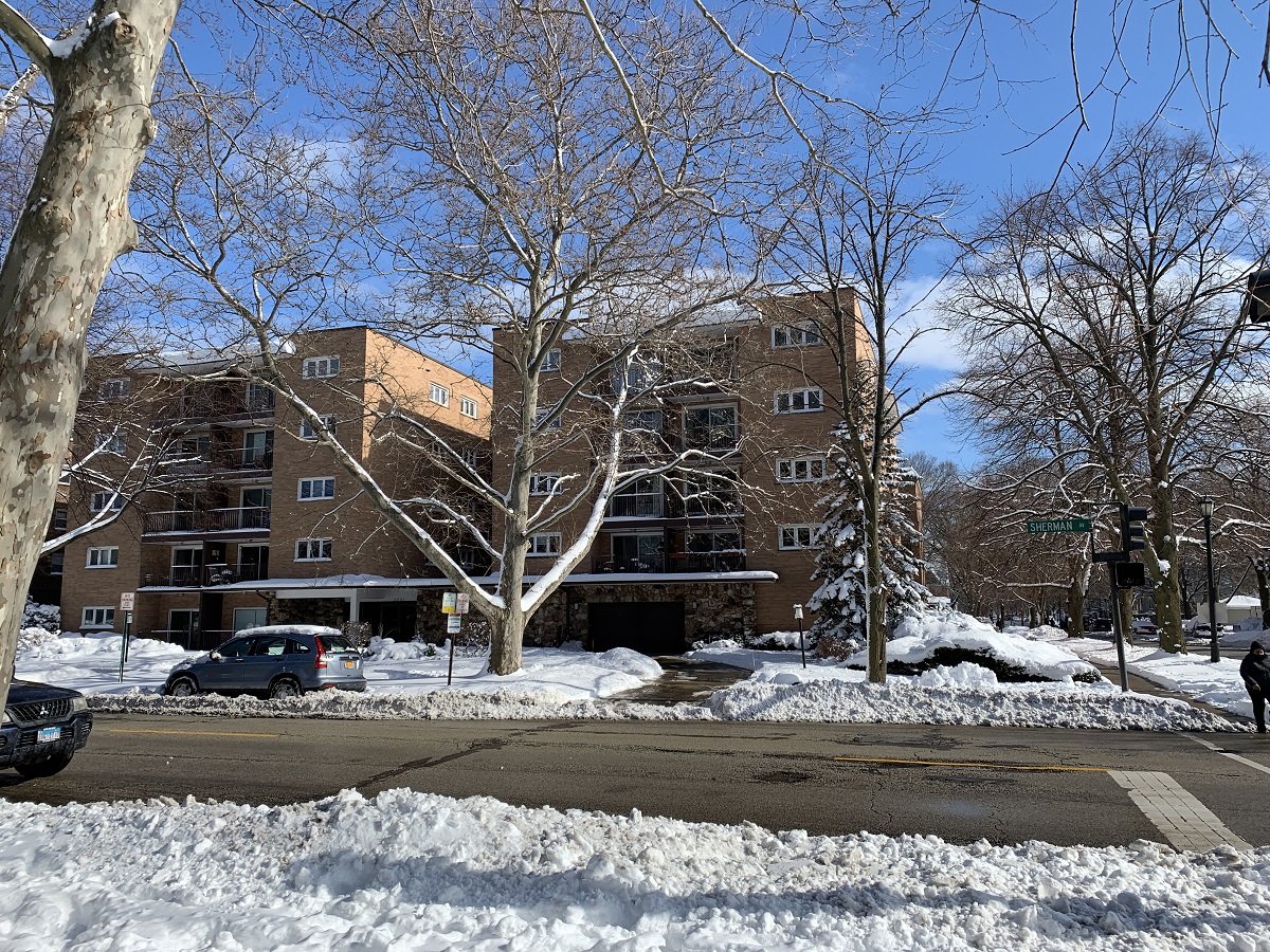 Snow on trees by "castle" condo building at Sherman and Noyes