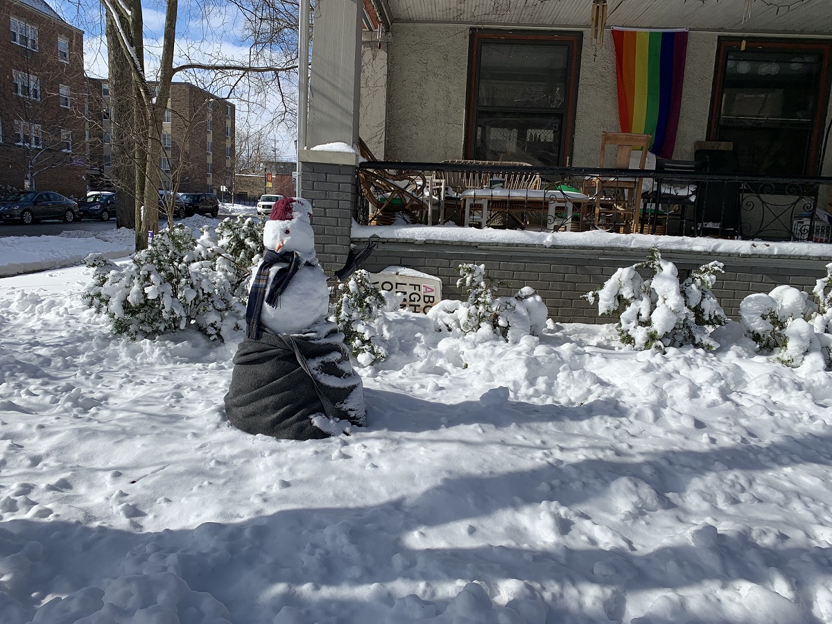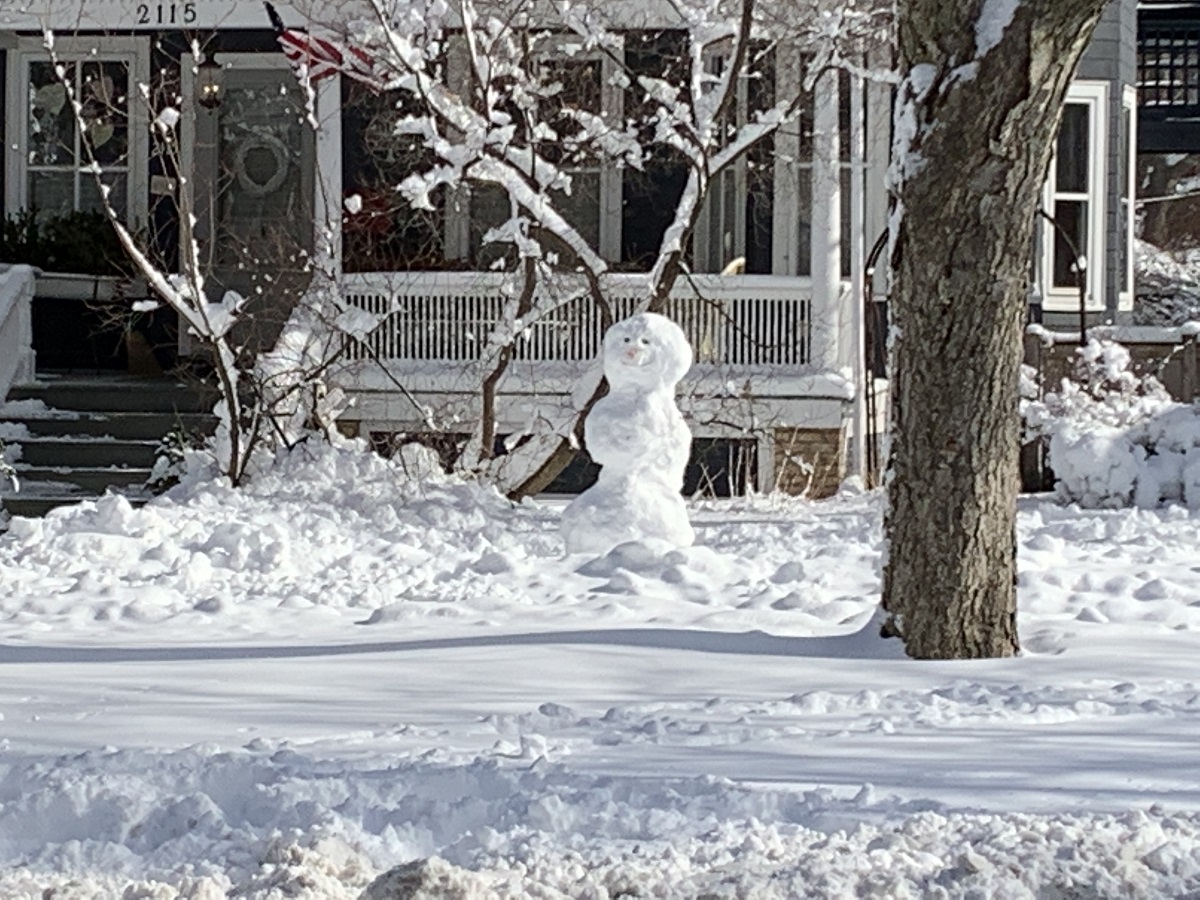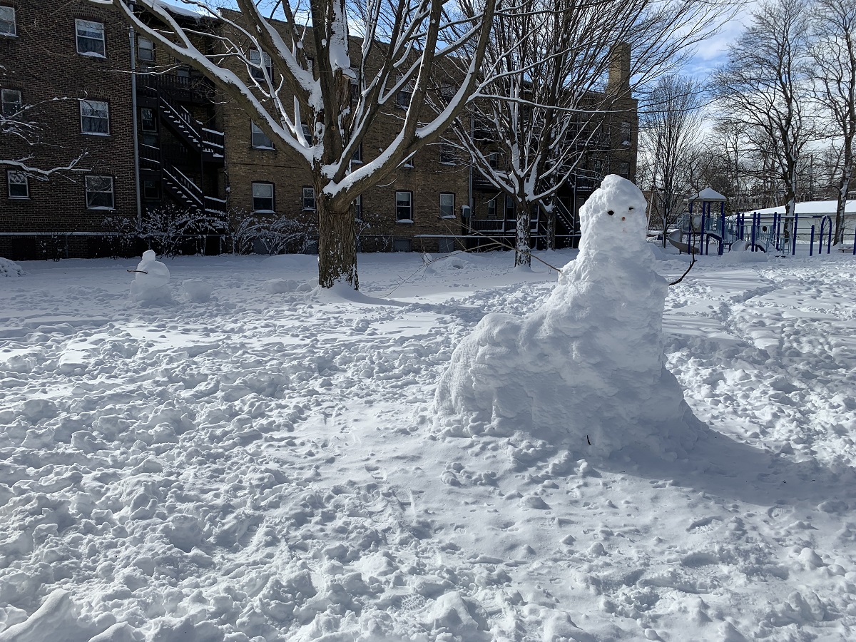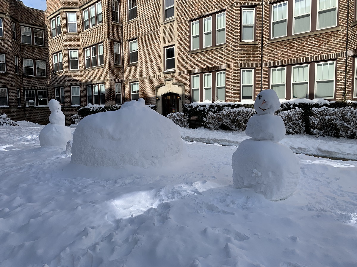 Snow on trees by "castle" condo building at Sherman and Noyes
