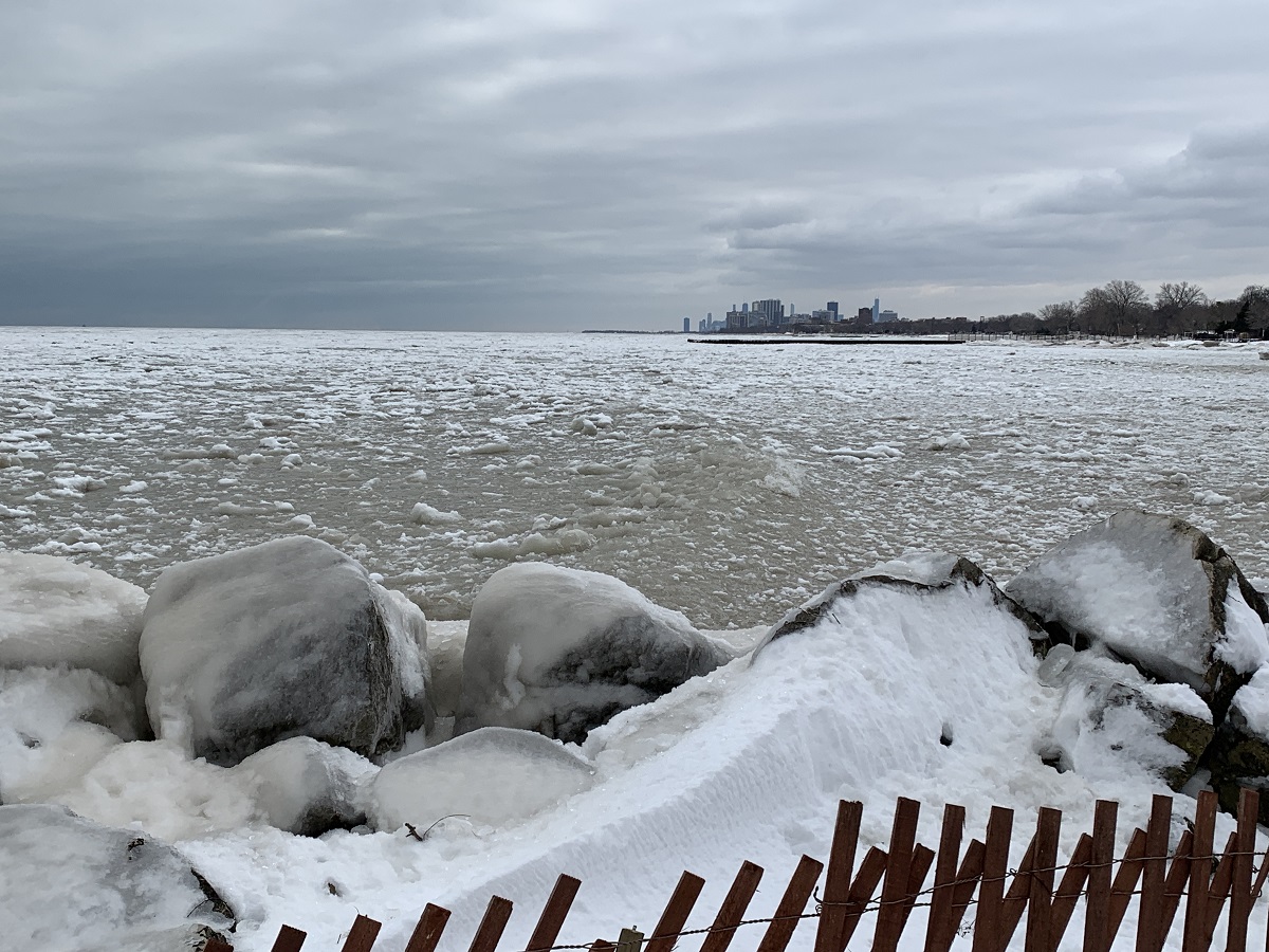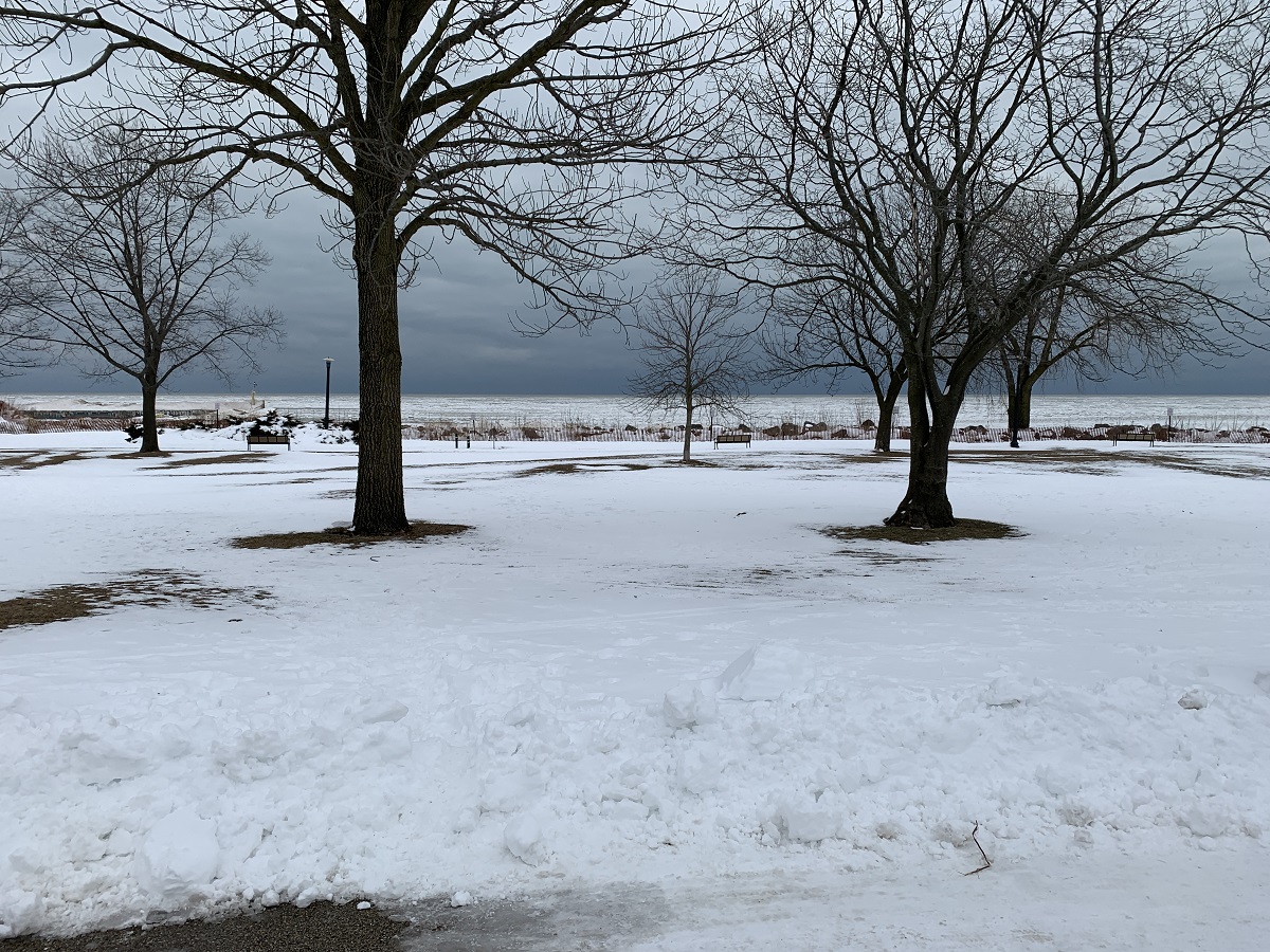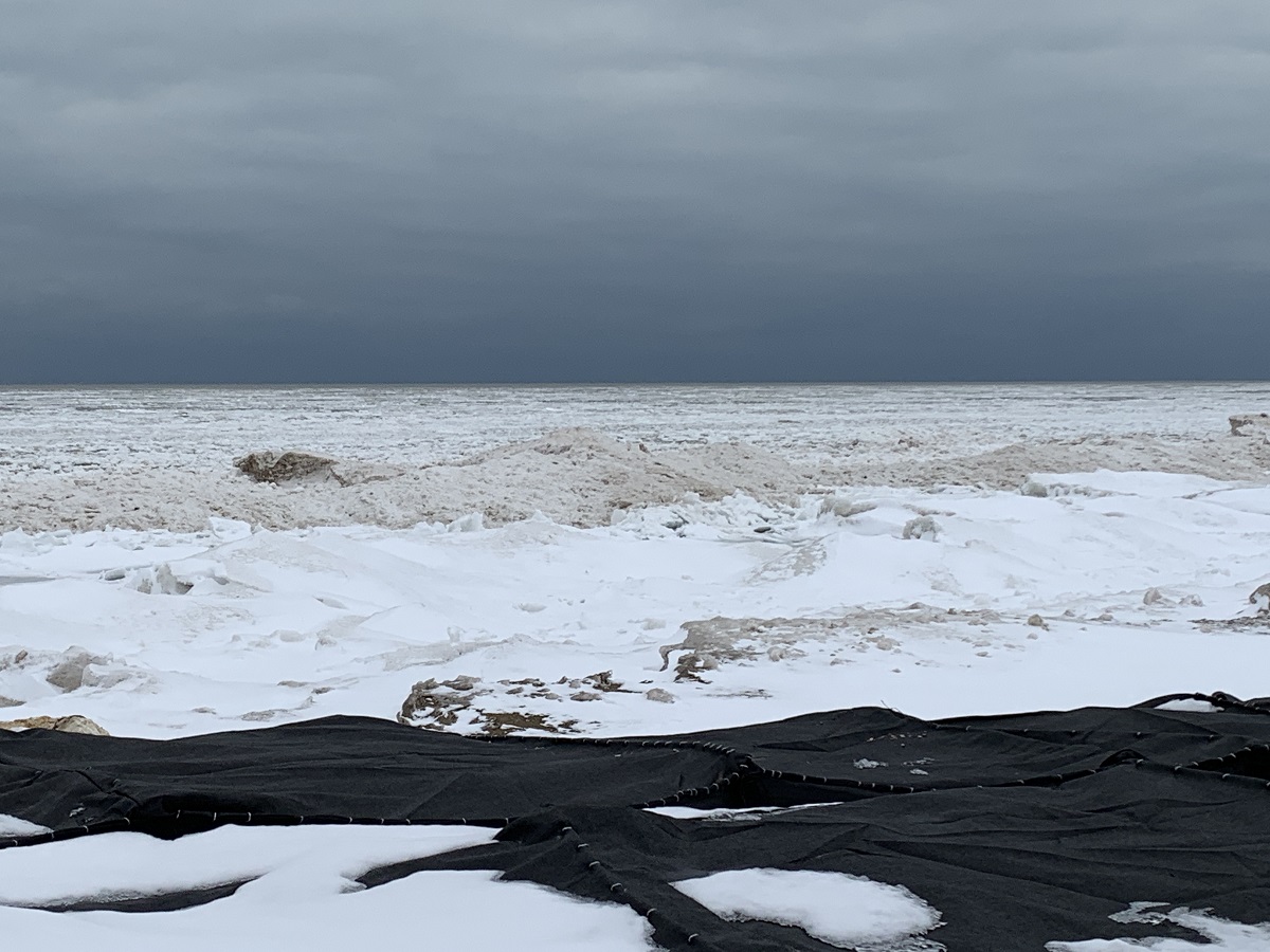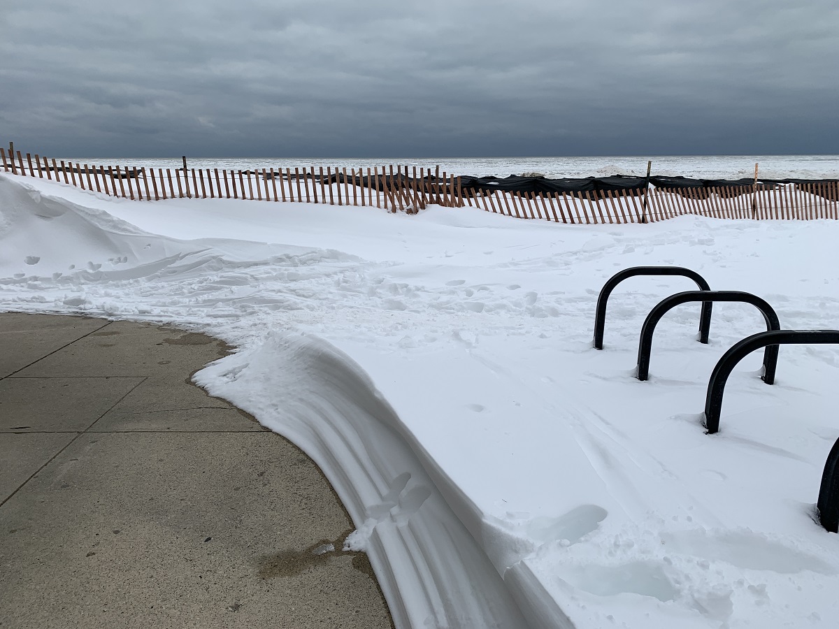 Snowdrifts and Lake Michigan from Greenwood Beach restrooms