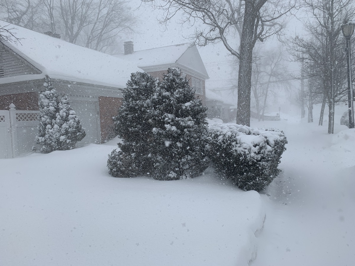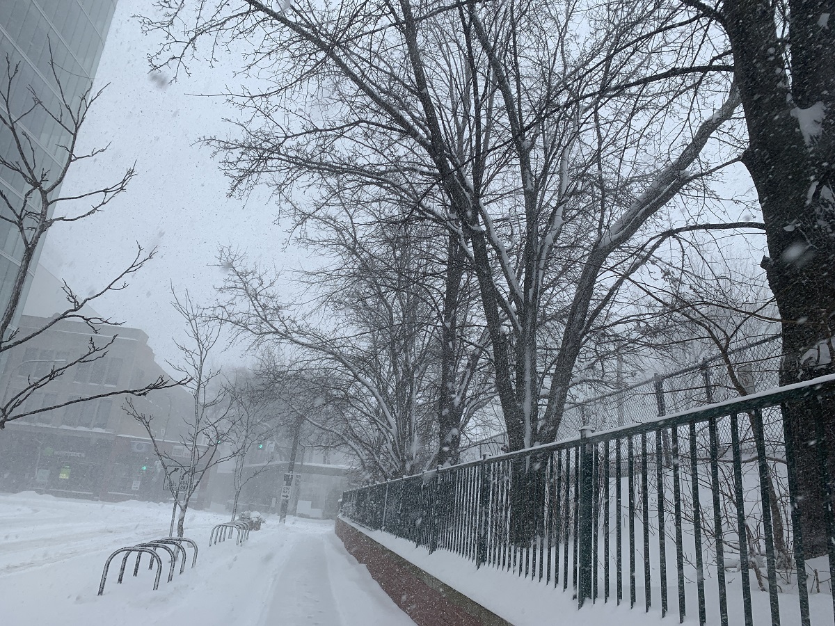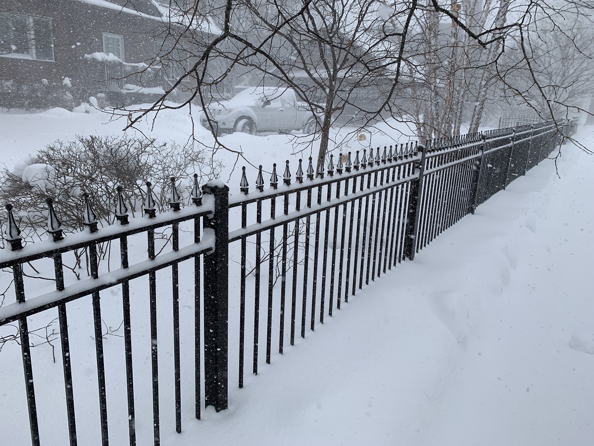 Snow on fence and tree trunks -- Davis "L" Downtown Evanston