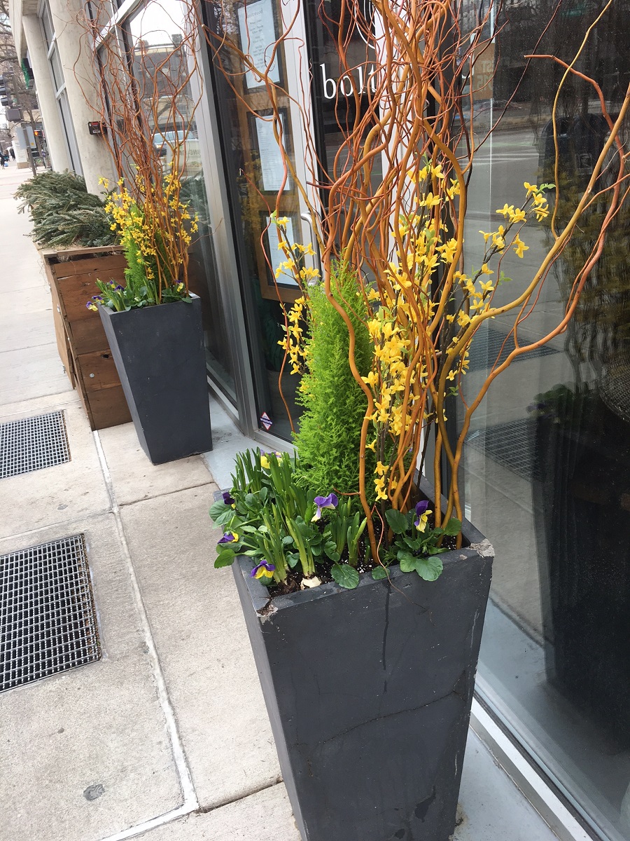 Good flower pots at Boltwood with forsythia, crocuses, daffodyls
