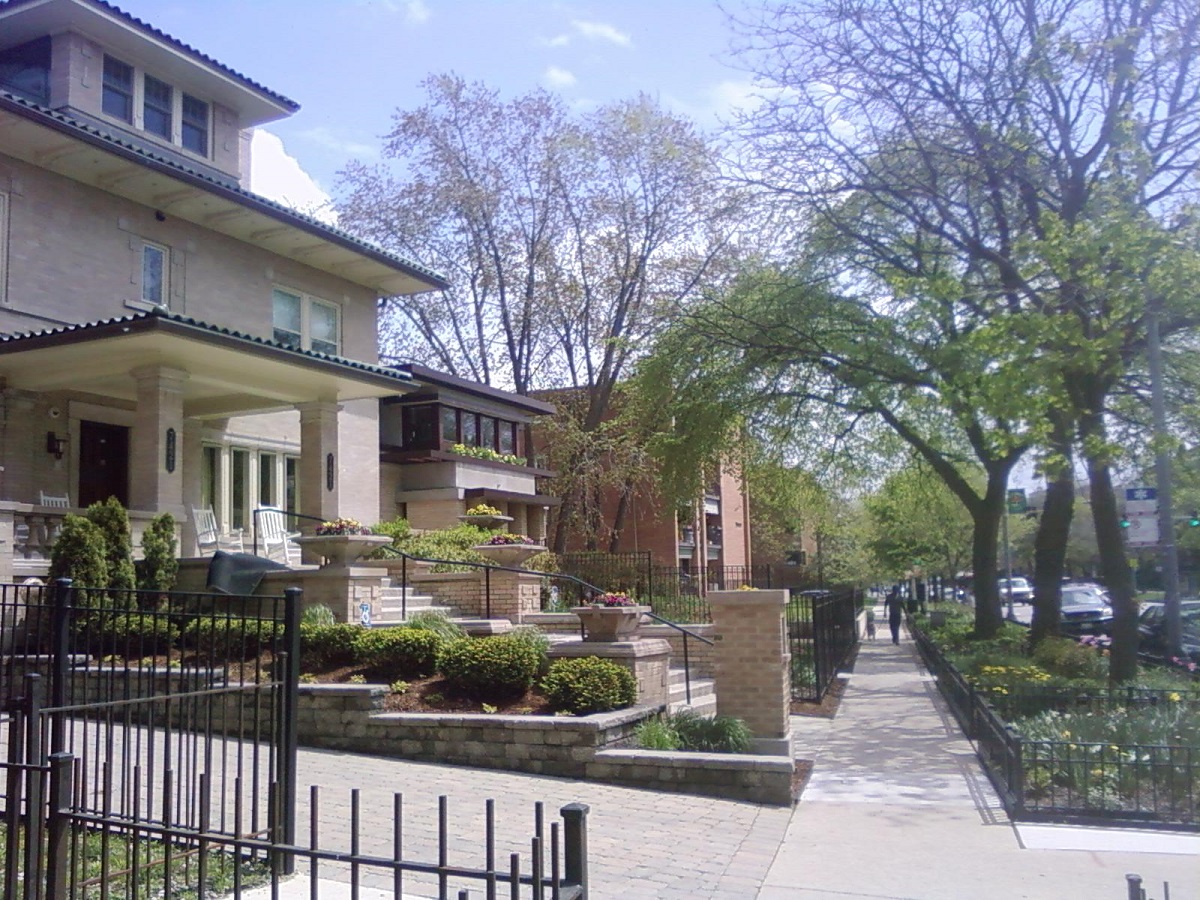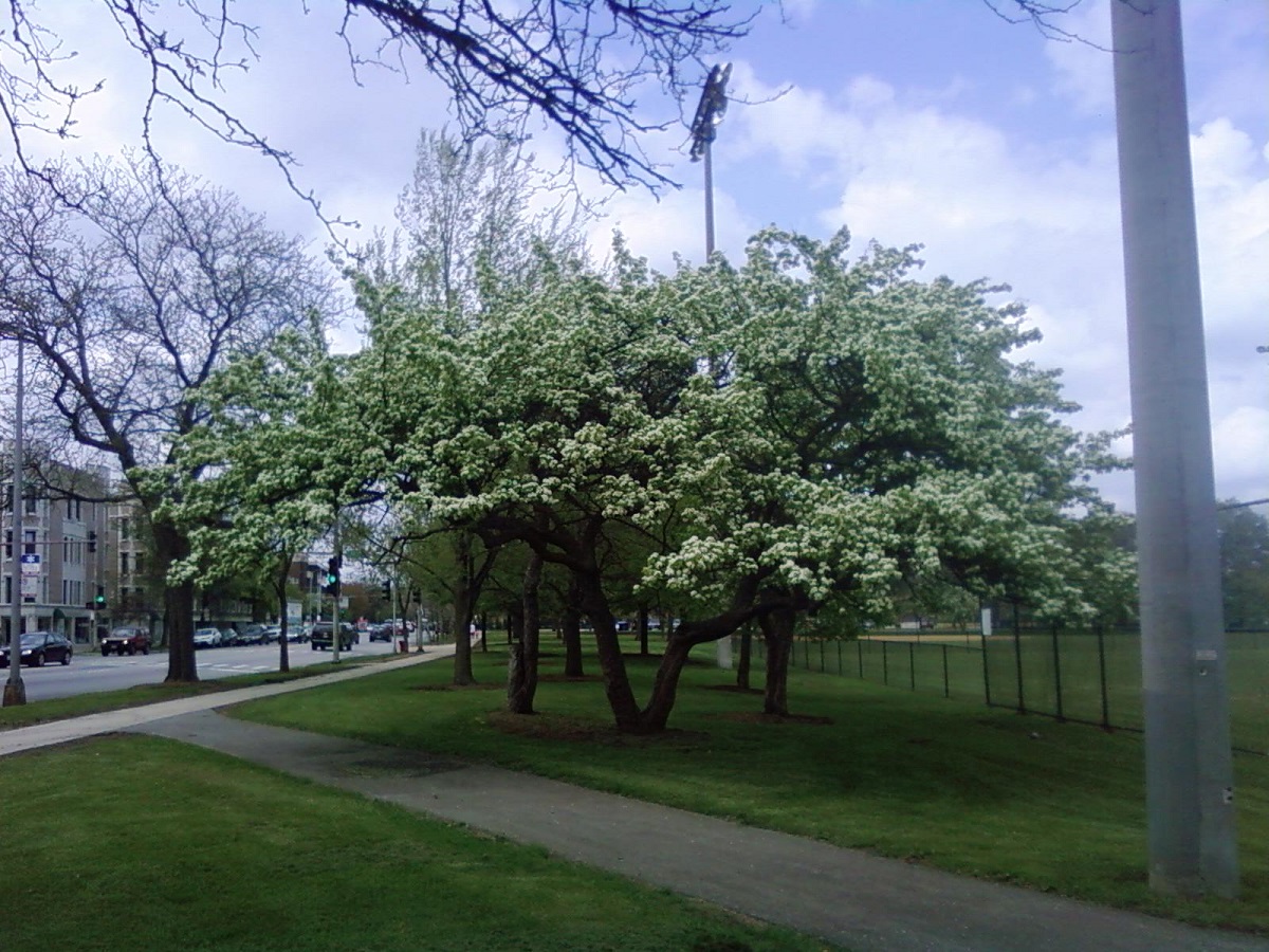 Many white blooming trees at SW corner of Loyola Park looking north on Sheridan -- last photo on May 15th