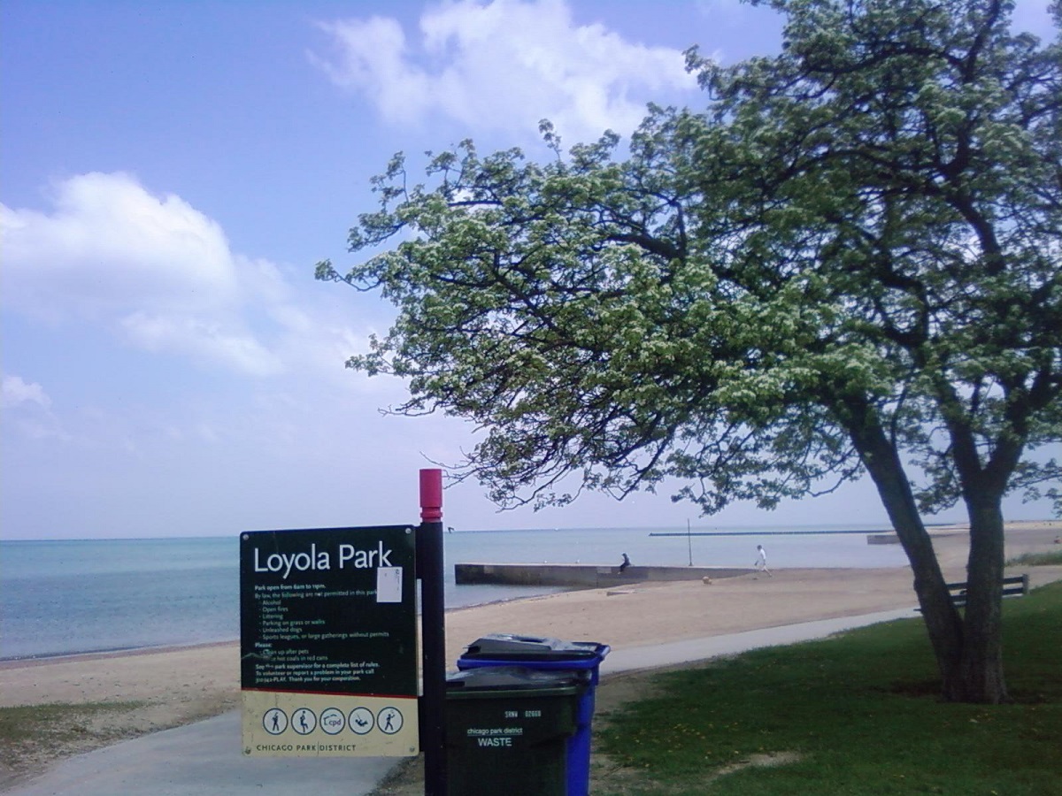 The sign for Loyola Park (as proof I made it there) with Lake Michigan and white blooming tree