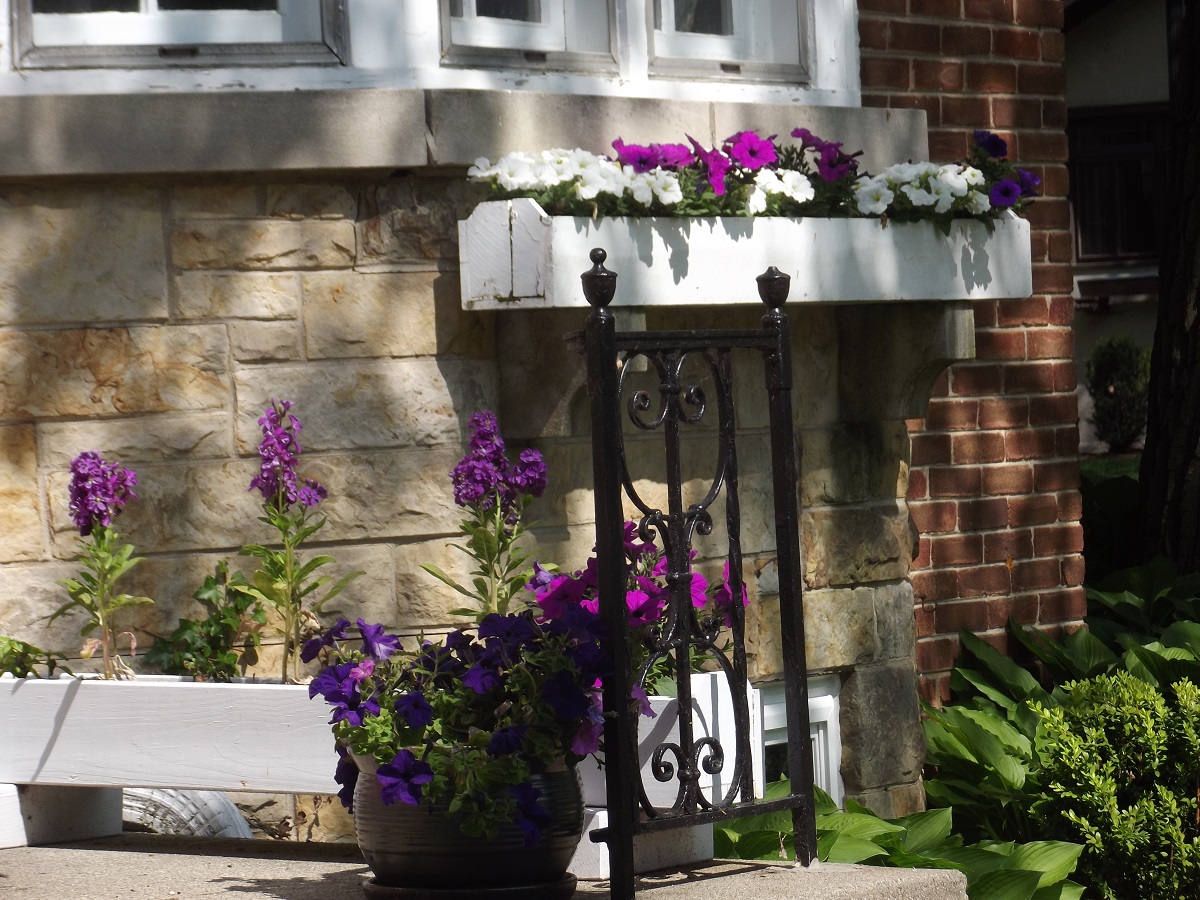 Purple and white flowers in box, but purple only below