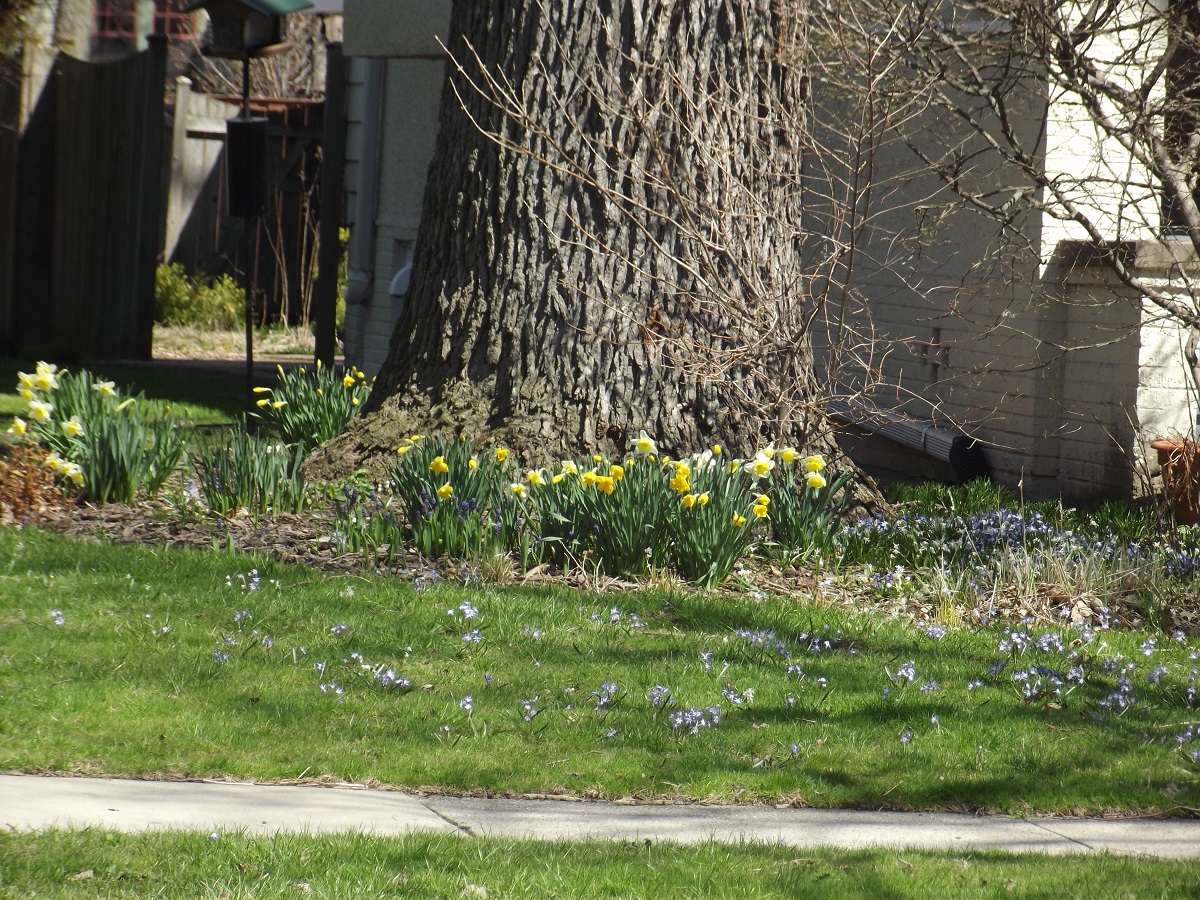 Daffodils and blue flowers on East Prairie Ave.