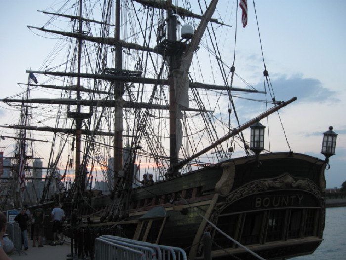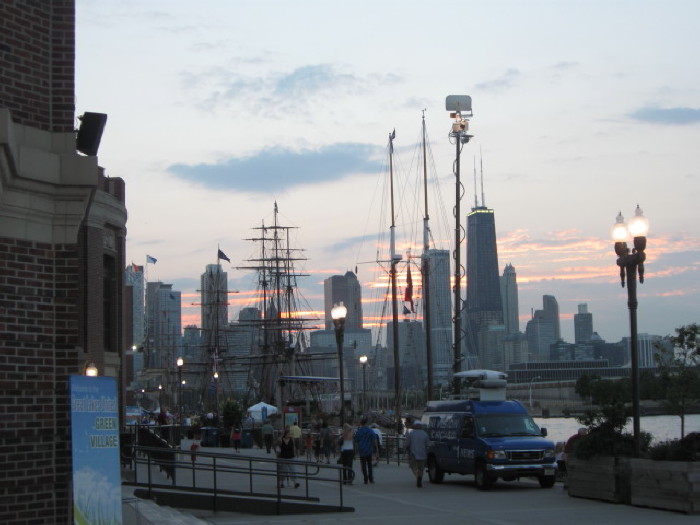 Tall ships by Navy Pier with sunset
