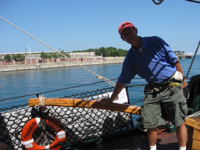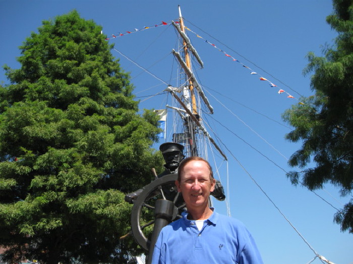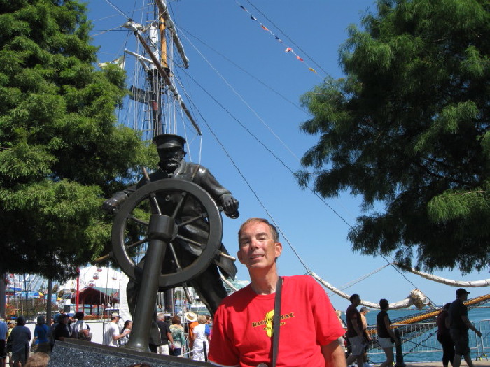 Andy and statue with tall ship