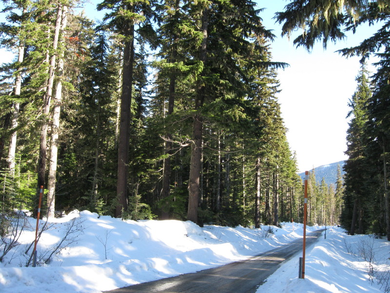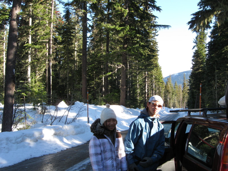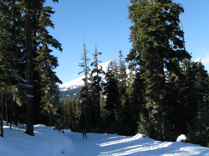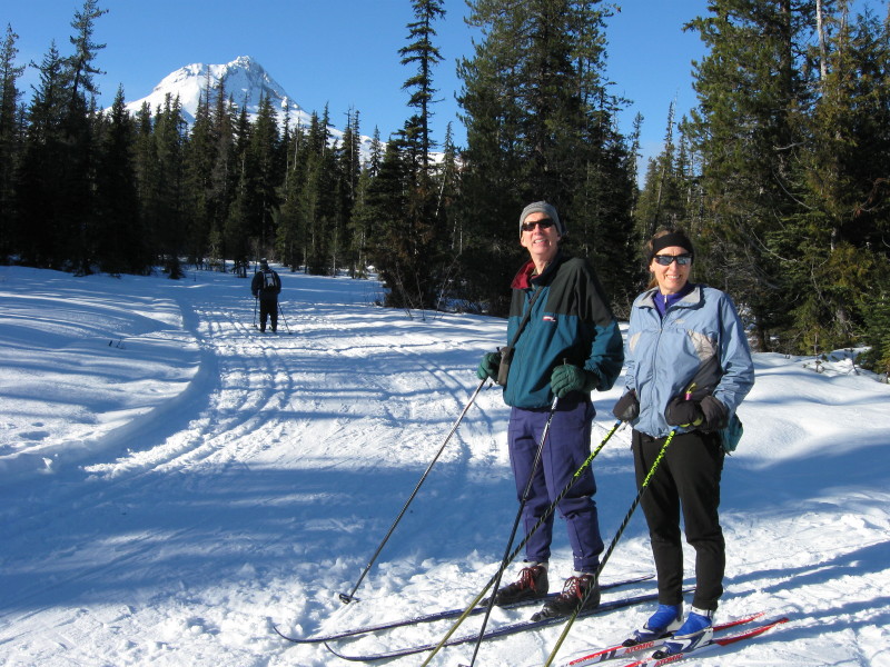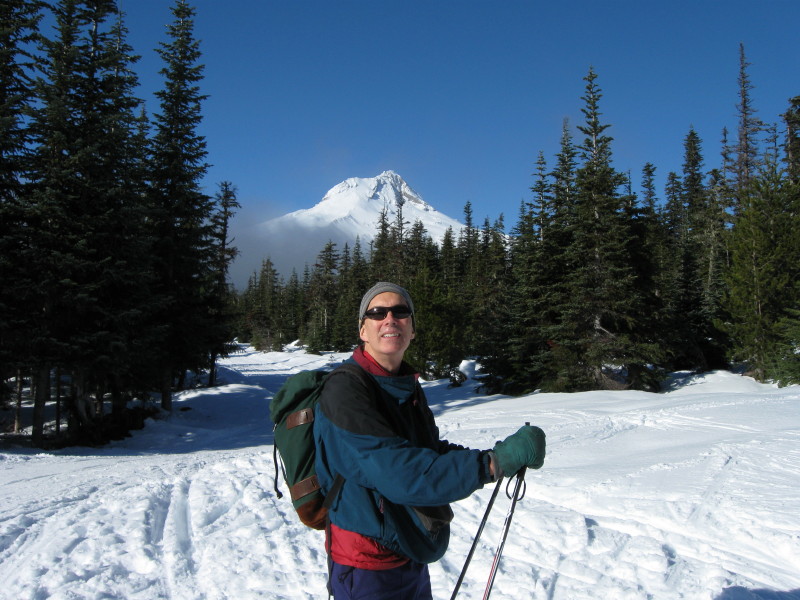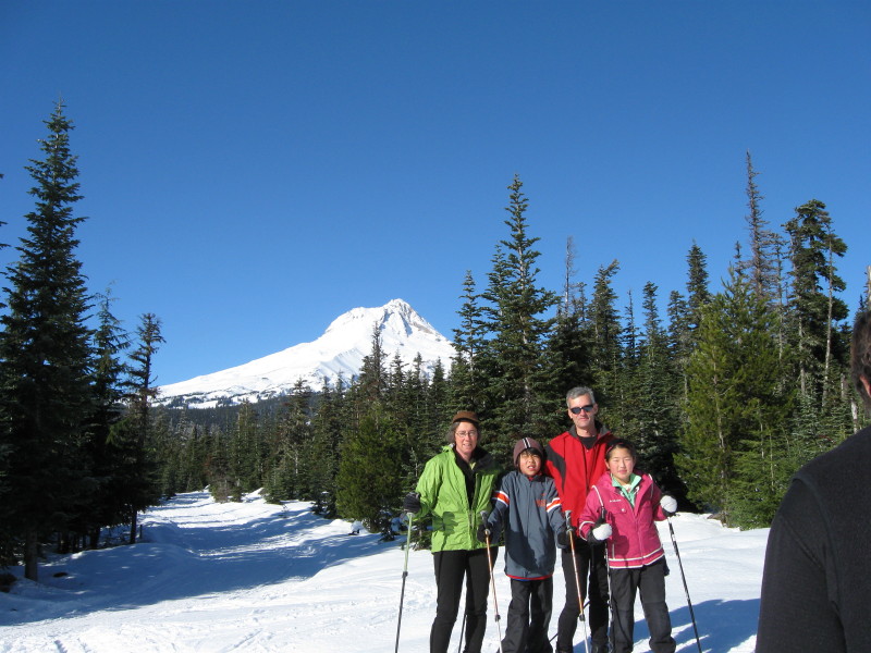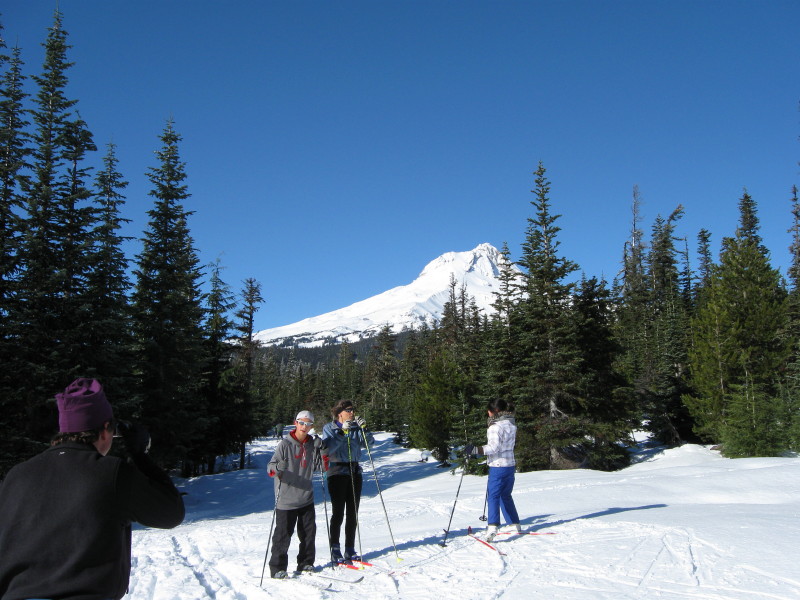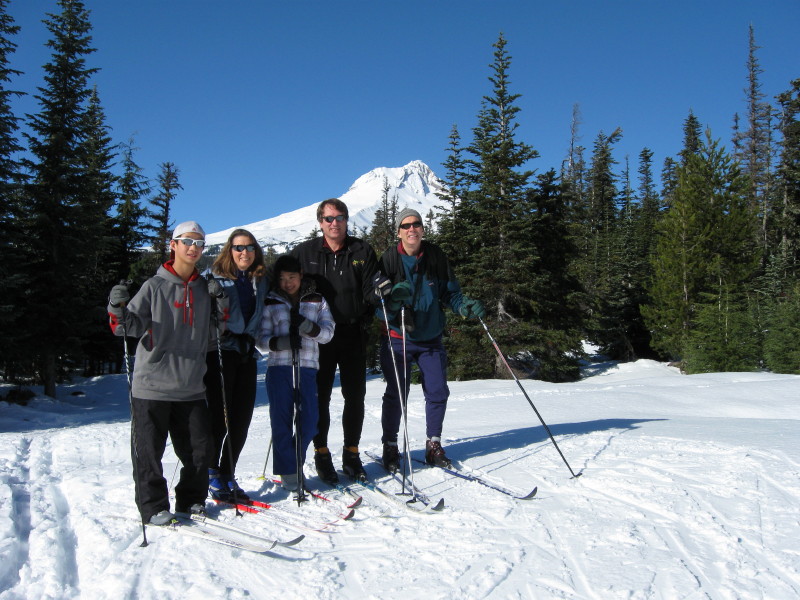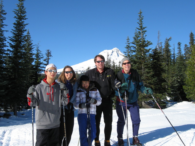 Duncan, Dorothy, Tara, Tom, Andy with Mount Hood XC skiing