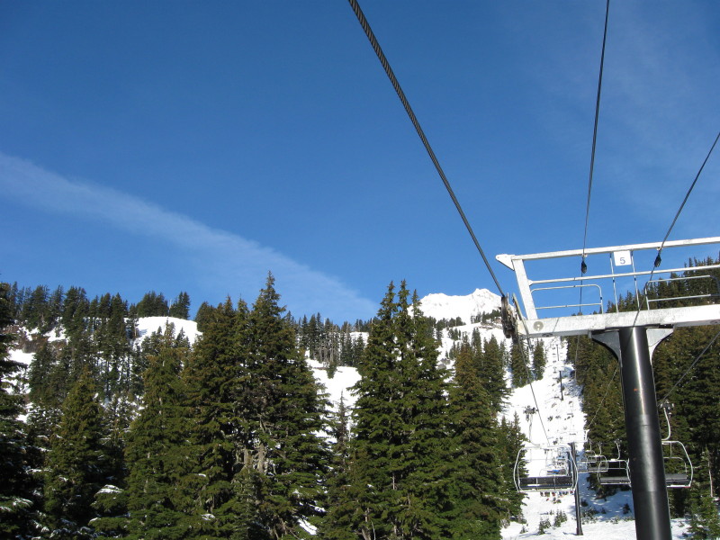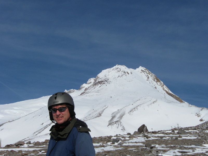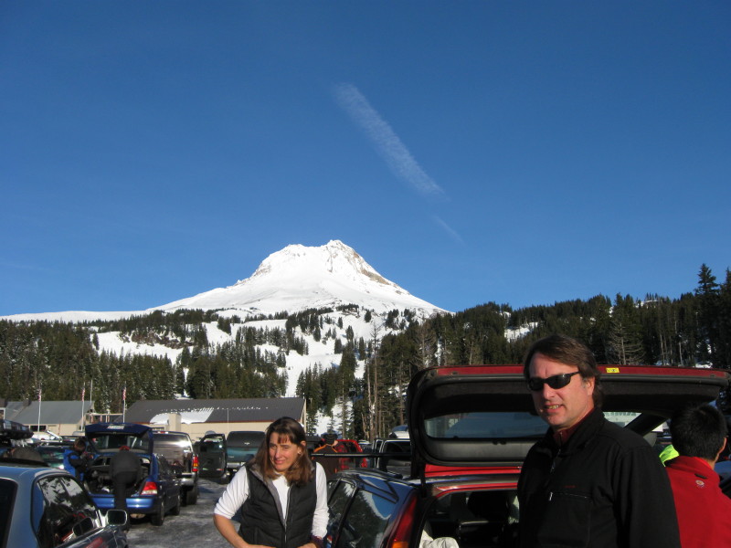 Dorothy & Tom with Mount Hood parking before downhill skiing 11/29/09