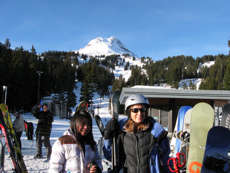 Tara, Dorothy with Mount Hood after downhill sking 11/30/09