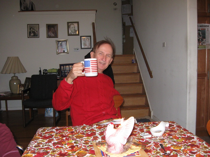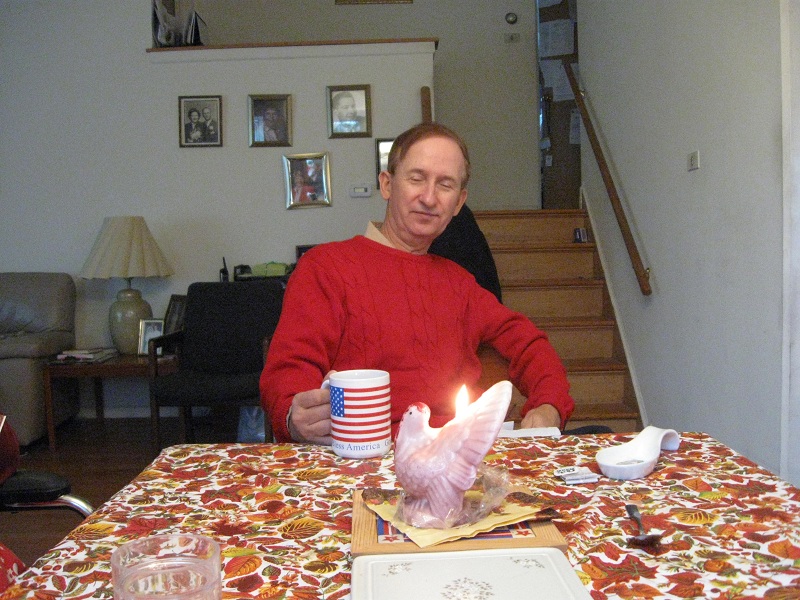 Andy with his birthday cheesecake, candle, and turkey candle