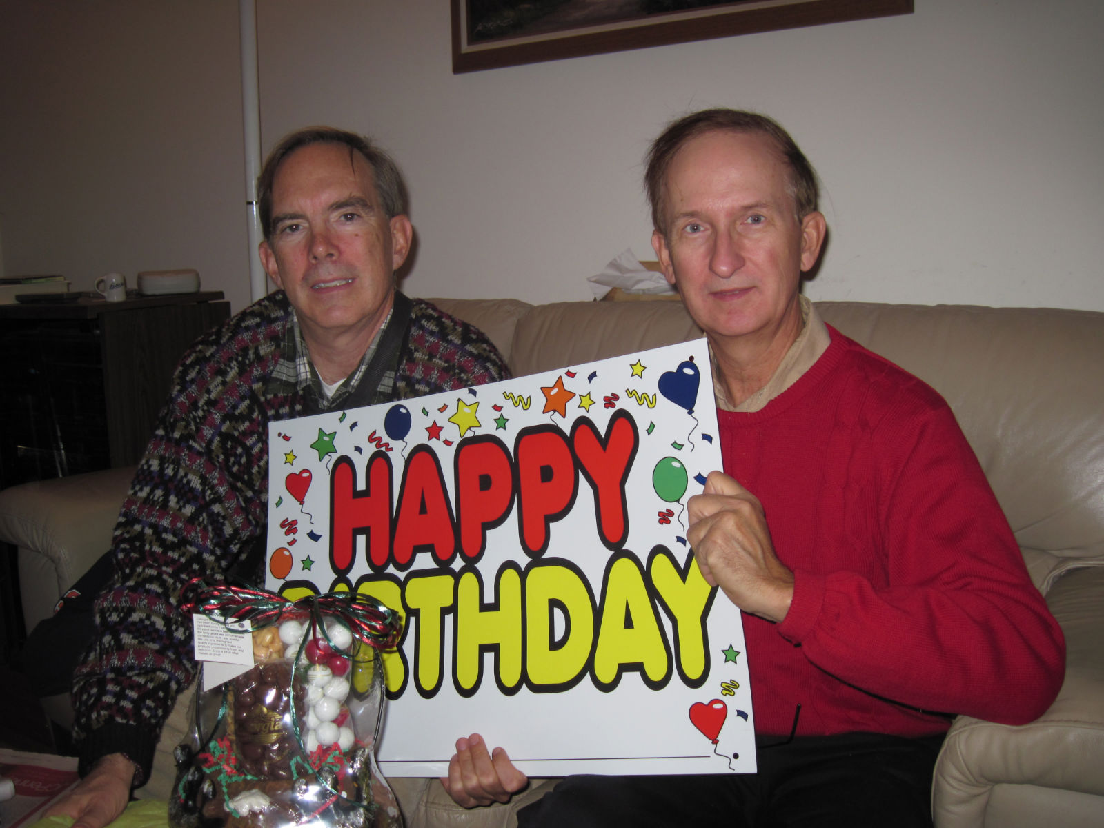 Andy, Bill with "Happy Birthday" poster and some of Andy's presents