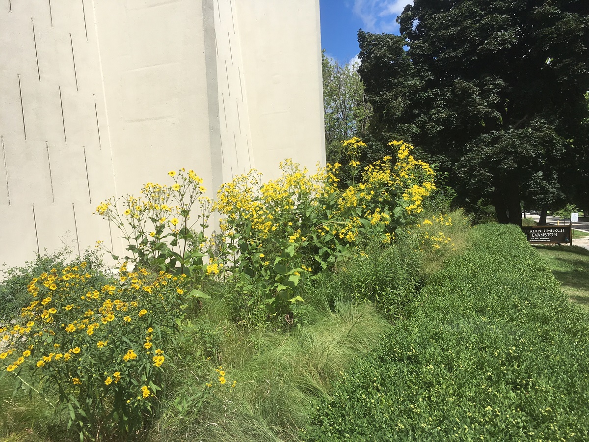 Many tall flowers beyond and plants in Bill Fisher Memorial Rain Garden south of church