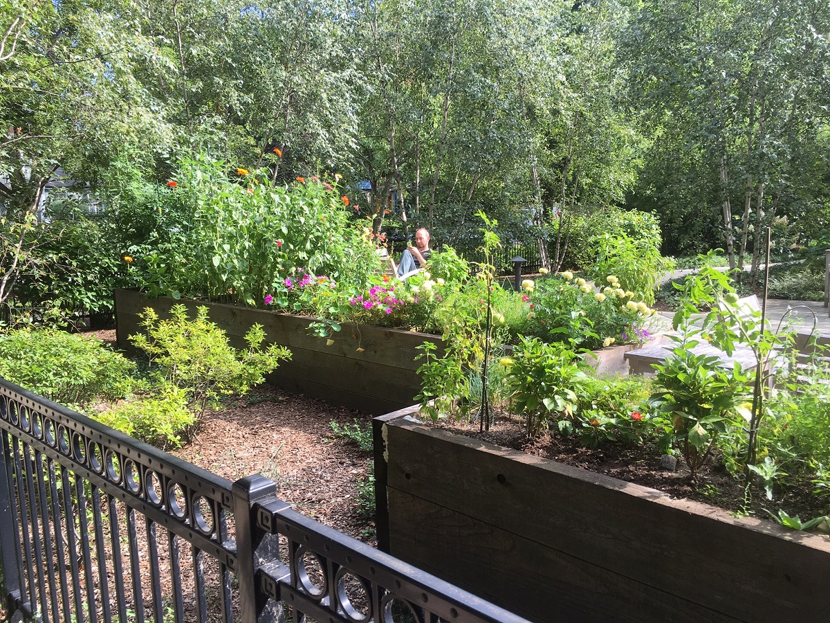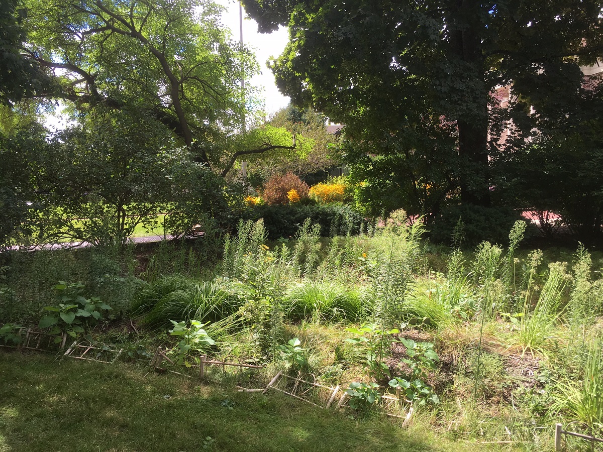 Many tall flowers and plants in Marjorie Fisher Memorial Rain Garden