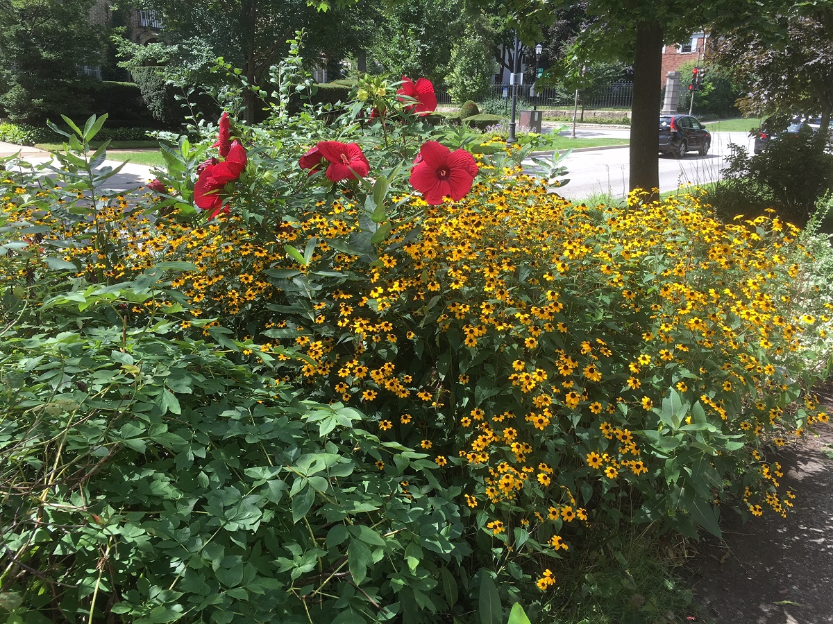 Many black eyed susans with three large red flowers on Lake street a little over a block from Unitarian Church
