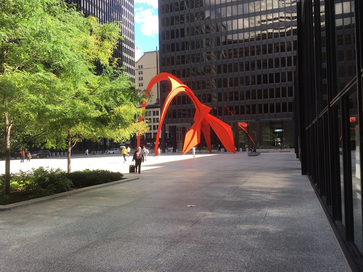 Large orange sculpture near downtown Chicago post office after Unitarian Universalists for Social Justice Environmental Task Force meeting