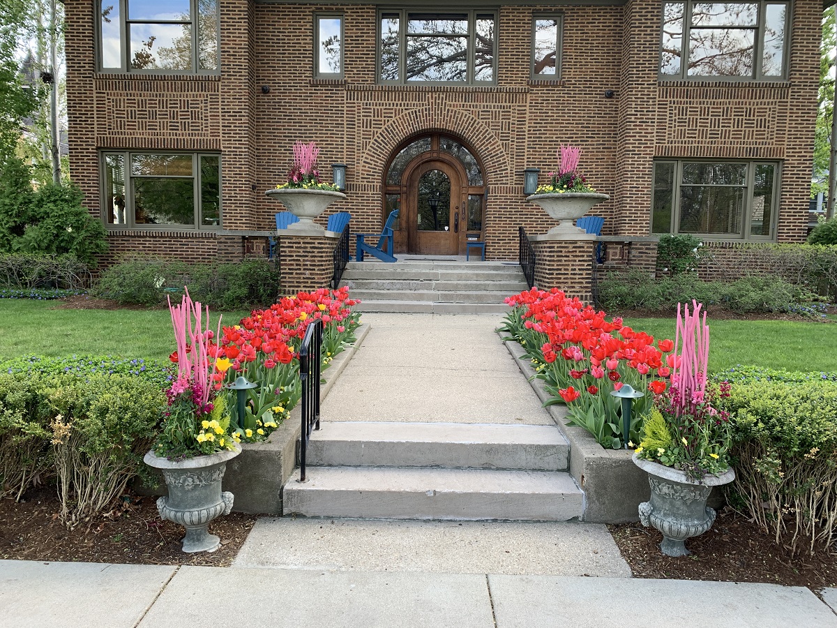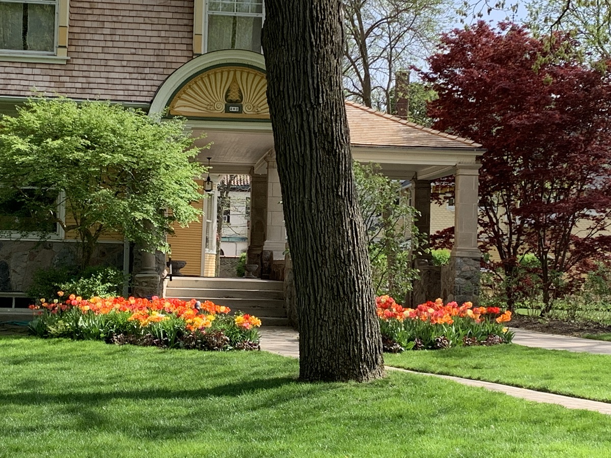 Bright tulips by front door along Greenwood Street