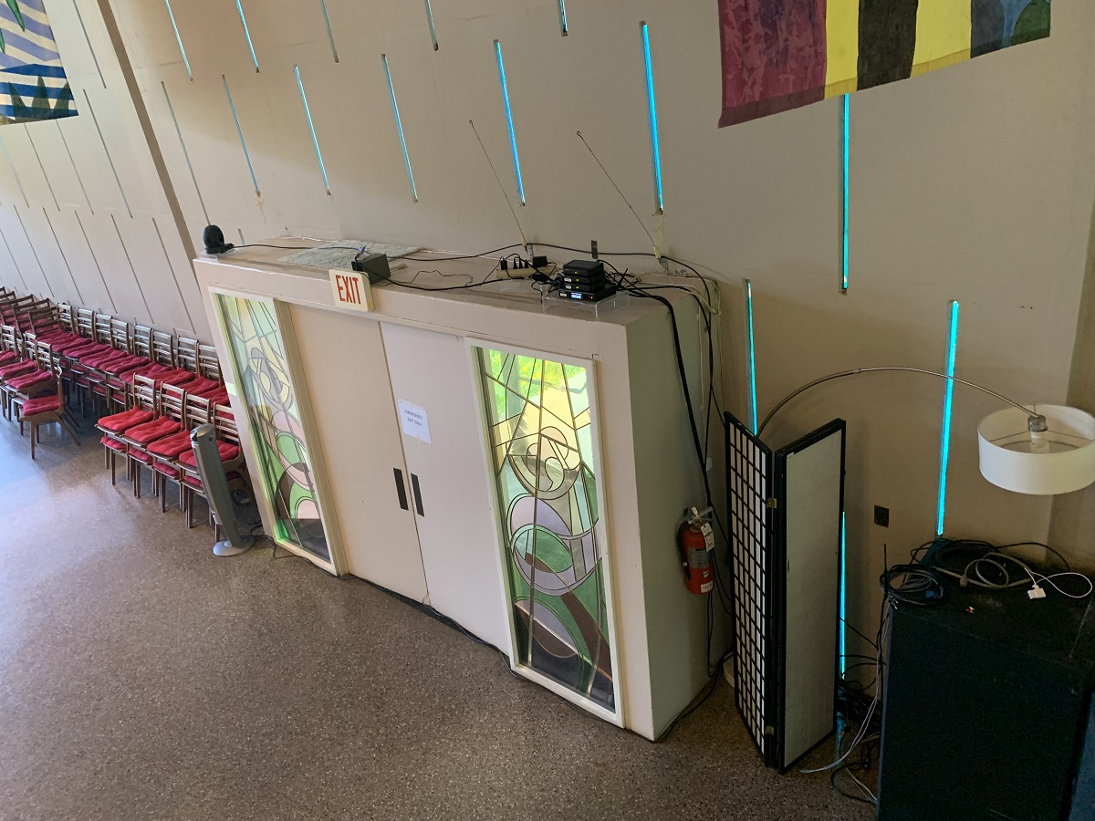 Adam's cameras and amplifiers on top of east door to sanctuary with air filter there