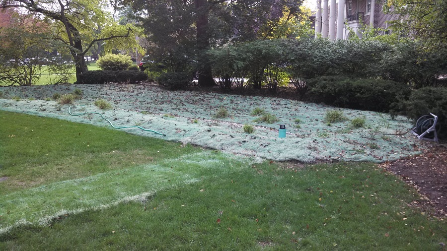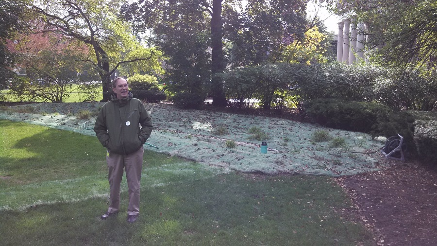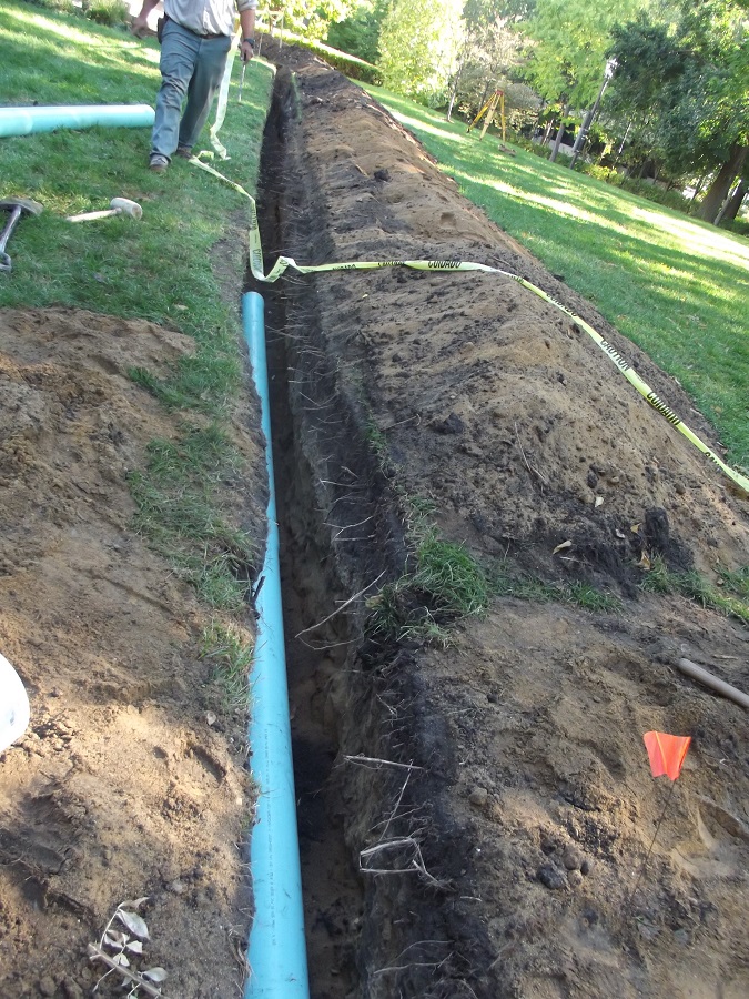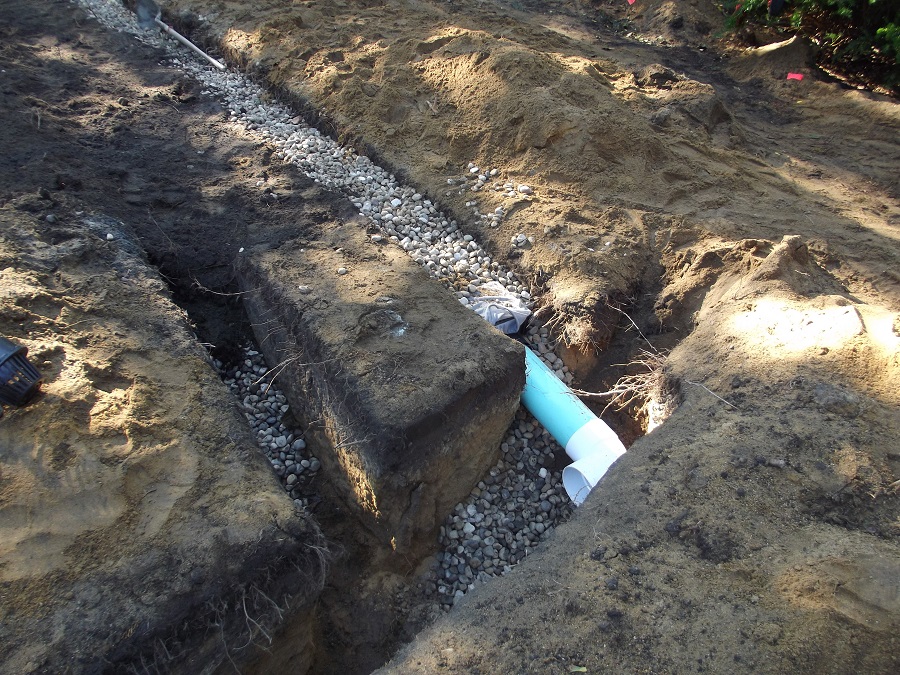 A pipe buried in gravel with an elbow turn in the south rain garden -- still September 30, 2013