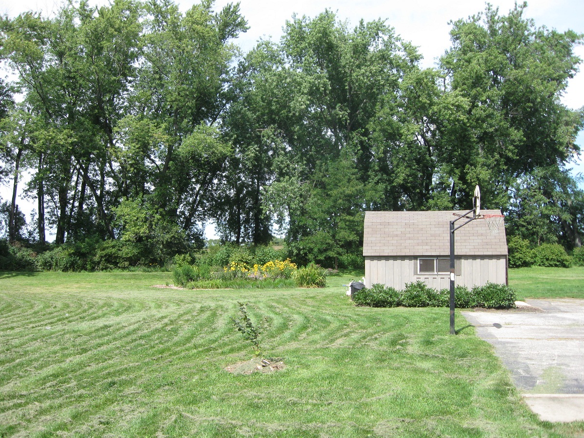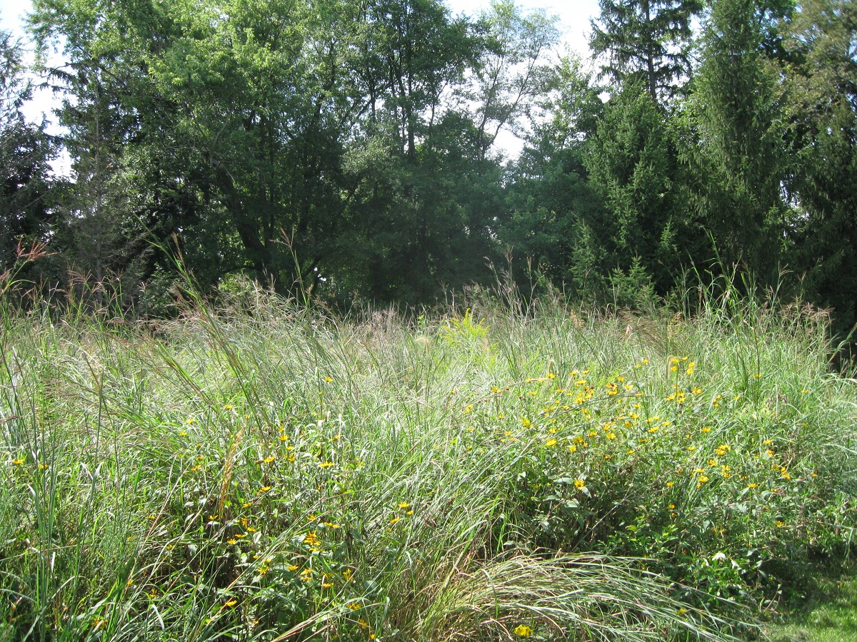Tall grass native prarie on church grounds. Every year or so they have a controlled burn off. This not only clears the land and burns most invasive plants, but is also very healthy for the prairie because: (1) all native plants are perennials so their roots extent twelve inches to over three feet into the soil -- most of their life is in their roots, and (2) for years before Europeans "discovered" the Midwest, there were natural fires from lightning which cleared the growth and small trees to leave only this native prairie behind.