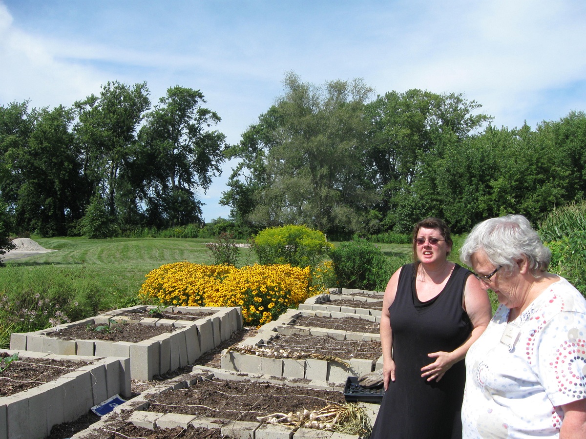 Donna Askins describing the Community Garden. Each square garden plot was originally from old (NOT chemically treated) timbers that eventually rotted and were replaced by a generous donation form the fire deepartment of the current stones which are wired together with cable(s). The crops grown in the rich composted soil are donated to local soup kitchens and poor people who otherwise could never afford nutritous, organic produce. The crops are properly rotated and currently contain garlic. Unfortunately, most white middle class people are not willing to "get their fingers dirty" and work in the garden, so much of the labor and upkeep comes from poor children and grownups.