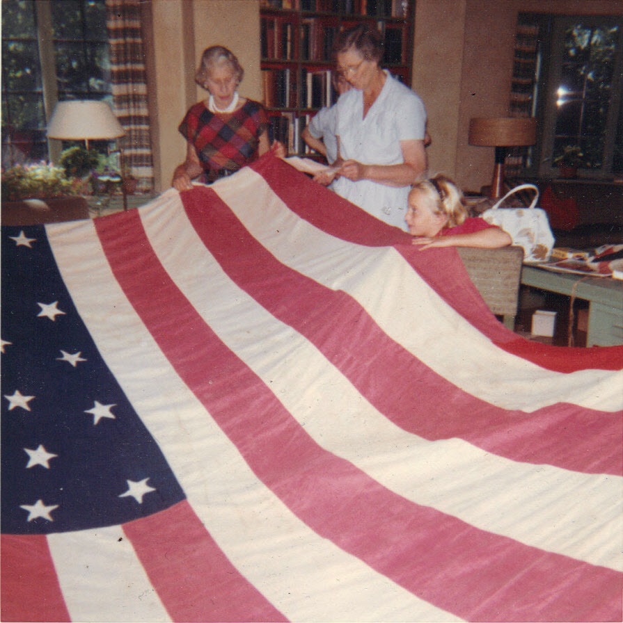 Katherine, Carol, others getting out HUGE US flag-- summer, 1960