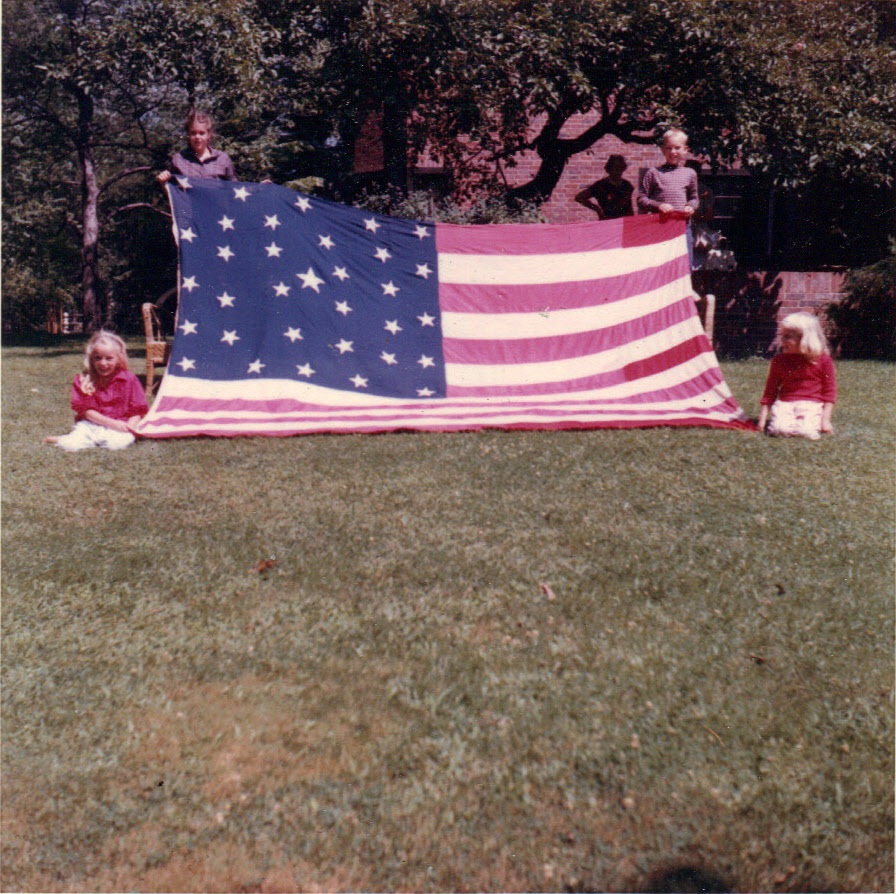 Carol, Laurie, Andy, Dorothy holding HUGE US flag -- summer, 1960