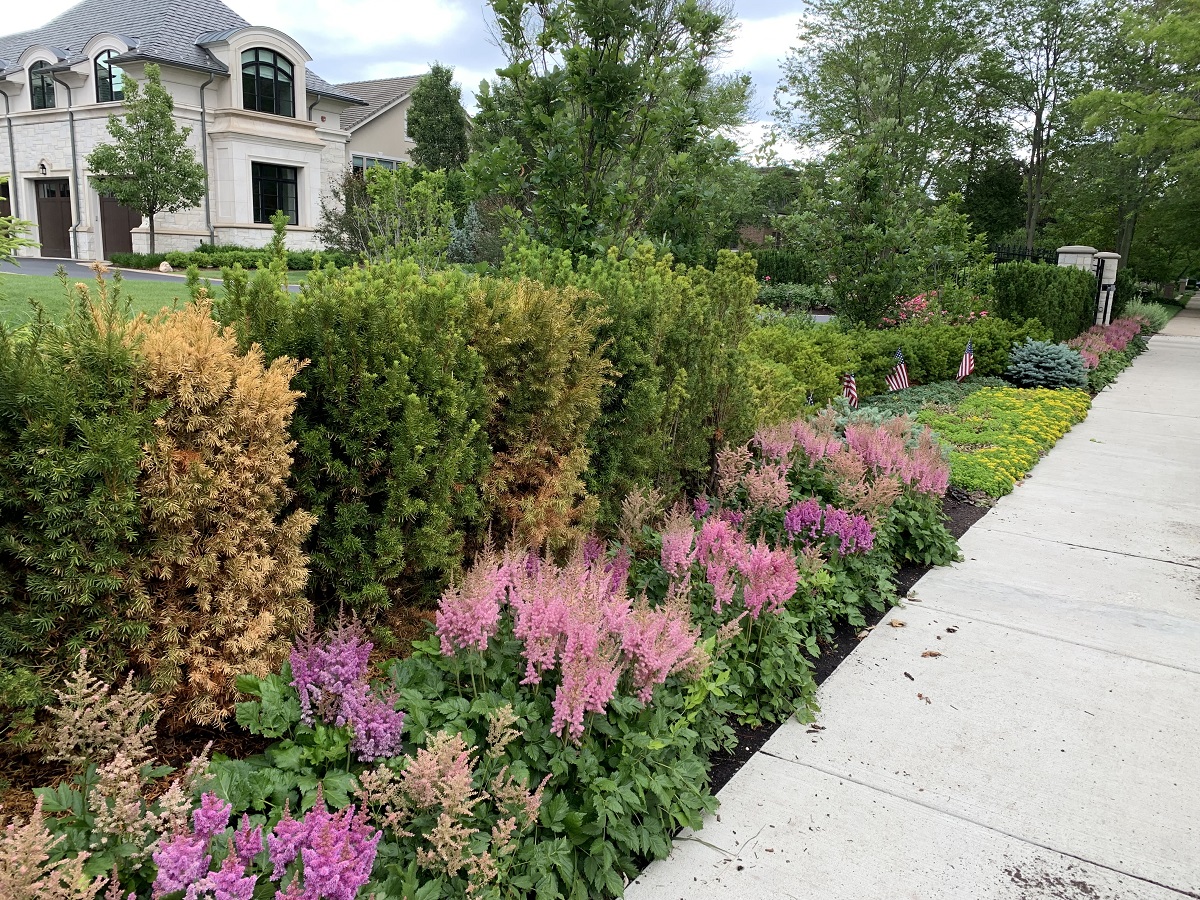 Flowers and flags by mansion on Michigan Avenue, Wilmette